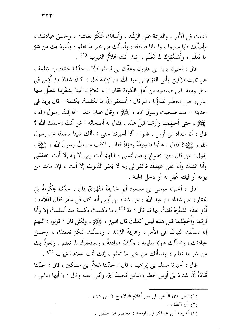 قال: أخبرنا يزيد بن هارون وعفّان بن مُسلم قالا: حدّثنا حَمّاد بن سَلَمة، عن ثابت البُنَانِيّ وأبي العَوّام بن عبد الله بن بُرَيْدَة قال: كان شدادُ بنُ أَوْس في سفر ومعه ناس صحبوه من أهل الكوفة فقال: يا غلامُ، آتينا بسُفْرَتِنا نتعلَّل منها بشئ حتَّى يَحضُر غَداؤُنا، ثمّ قال: أستغفر اللَّه ما تكلمتُ بكلمة - قال يزيد في حديثه - منذ صحبت رسولَ الله، - صلى الله عليه وسلم -، وقال عفّان منذ - فارقتُ رسولَ الله، - صلى الله عليه وسلم -، حتَّى أخطِمَها وأزمّها قبلَ هذه. فقال له أصحابُه: مَن أنتَ رَحمك الله؟ قال: أنا شداد بن أوس. قالوا: ألا أخبرتنا حتَّى نسألك شيئًا سمعتَه من رسول الله، - صلى الله عليه وسلم -؟ فقال: هاتُوا صَحِيفَةً ودَوَاةً فقال: اكتُب سمعتُ رسولَ الله، - صلى الله عليه وسلم -، يقول: من قال حين يُصبحُ وحين يُمسى، اللهمَّ أنت ربي لا إله إِلَّا أنت خلقتَنى وأنا عَبُدك وأنا على عهدِك فاغفر لي إنه لا يَغفِر الذنوبَ إِلَّا أنت، فإن مات من يومه أو ليلته غُفِر له أو دخل الجنّة.