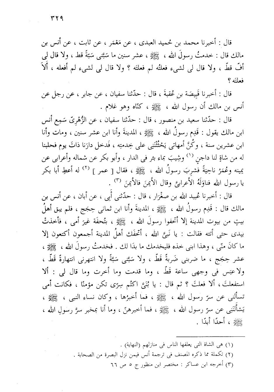 قال: أخبرنا عُبيد الله بن صغْرَار، قال: حدّثني أَبِى، عن أبان، عن أنس بن مالك قال: قَدِم رسول الله، - صلى الله عليه وسلم -، المدينةَ وأنا ابن ثمانى حِجَج، فلم يبق أهلُ بيتٍ من سوت المدينة إِلَّا أتحفوا رسولَ الله، - صلى الله عليه وسلم -، بتُحفَة غيرَ أمى، فأخذتْ بيدى حتَّى أتته فقالت: يا نَبيَّ الله، أتحفَك أهلُ المدينة أجمعون أكتعون إِلَّا ما كانَ منِّى، وهذا ابنى خذه فليخدمك ما بدَا لك. فخدمتُ رسولَ الله، - صلى الله عليه وسلم -، عشر حِجَج، ما ضربنى ضَربةً قَطّ، ولا سَبَّنى سَبَّةً ولا انتهرنى انتهارةً قَطّ، ولا عبَس في وجهى ساعة قَطّ، وما قدمت وما أخرت وما قال لي: ألا استفعلتَ، ألا فعلتَ؟ ثمّ قال: يا بُنَيَّ اكتُم سِرّى تكن مؤمنًا، فكانت أمى تسألنى عن سرّ رسول الله، - صلى الله عليه وسلم -، فما أخبرُها، وكان نساء النبيّ، - صلى الله عليه وسلم -، يَسْأَلنَنى عن سرّ رسول الله، - صلى الله عليه وسلم -، فما أخبرهنّ، وما أنا بخبر سرَّ رسولِ الله، - صلى الله عليه وسلم -، أحدًا أبدًا.