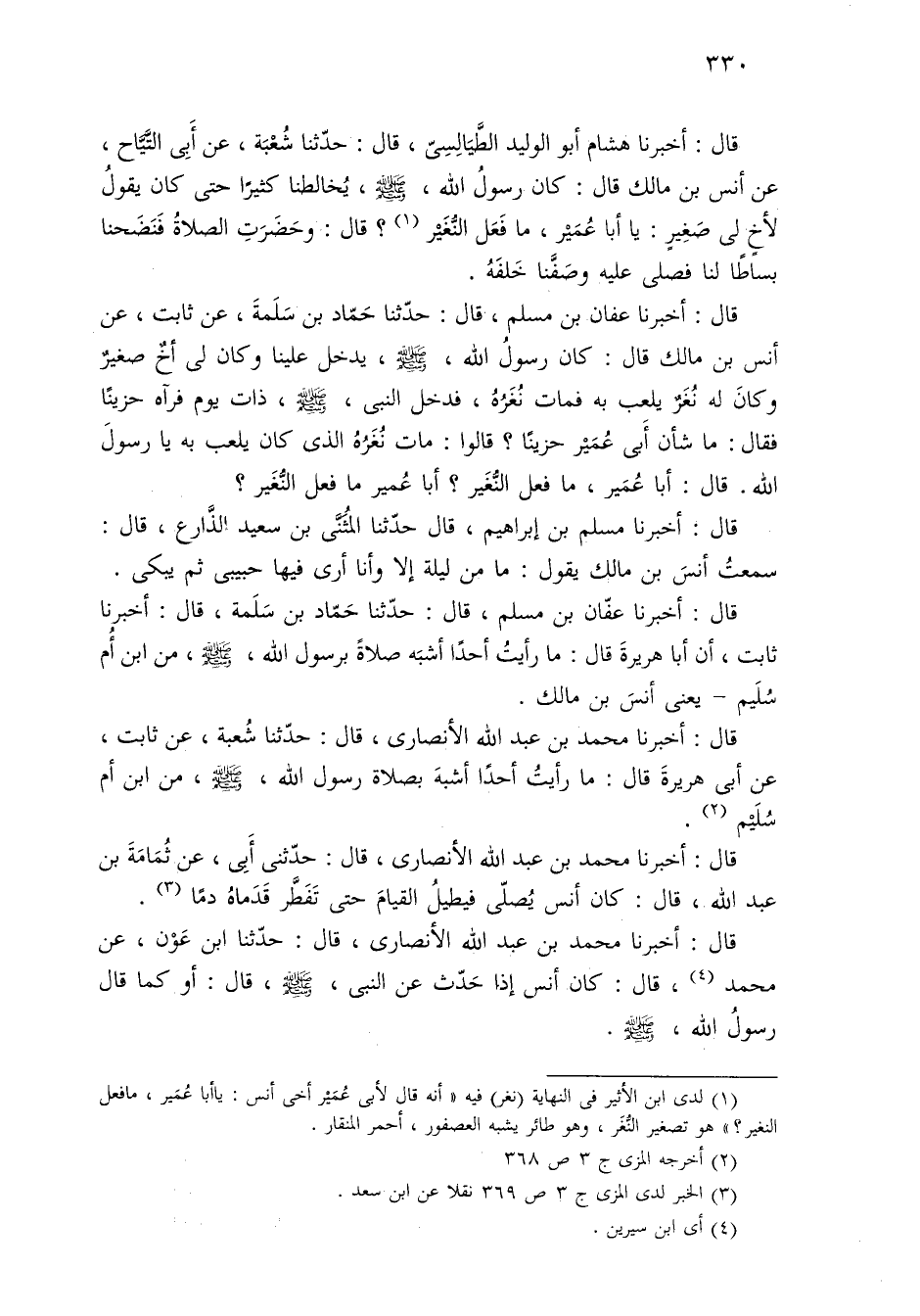 قال: أخبرنا عفّان بن مسلم، قال: حدّثنا حَمّاد بن سَلَمةَ، عن ثابت، عن أنس بن مالك قال: كان رسولُ الله، - صلى الله عليه وسلم -، يدخل علينا وكان لي أخٌ صغيرٌ وكانَ له نُغَرٌ يلعب به فمات نُغَرُهُ، فدخل النبيّ، - صلى الله عليه وسلم -، ذات يوم فرآه حزينًا فقال: ما شأن أَبي عُمَيْر حزينًا؟ قالوا: مات نُغَرُهُ الذي كان يلعب به يا رسولَ الله. قال: أبا عُمَير، ما فعل النُّغَير؟ أبا عُمير ما فعل النُّغَير؟