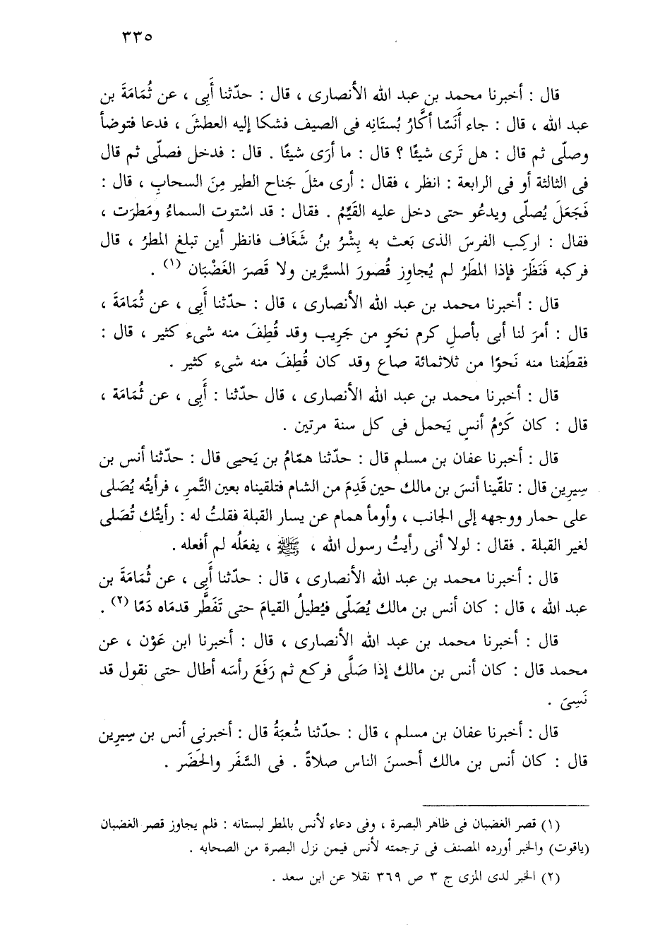قال: أخبرنا محمّد بن عبد الله الأنصاري، قال: حدّثنا أَبِي، عن ثُمَامَةَ بن عبد الله، قال: جاء أَنَسًا أكَّارُ بُستَانِه في الصيف فشكا إليه العطش، فدعا فتوضأ وصلّى ثمّ قال: هل تَرى شيئًا؟ قال: ما أرَى شيئًا. قال: فدخل فصلّى ثمّ قال في الثالثة أو في الرابعة: انظر، فقال: أرى مثلَ جَناح الطير مِنَ السحابِ، قال: فَجَعَلَ يُصلّى ويدعُو حتَّى دخل عليه القَيِّمُ. فقال: قد اسْتوت السماءُ ومَطرَت، فقال: اركِب الفرسَ الذي بَعث به بِشْرُ بنُ شَغَاف فانظر أين تبلغ المطرُ، قال فركبه فَنَظَرَ فإذا المطَرُ لم يُجاوِز قُصورَ المسيَّرين ولا قَصرَ الغَضْبَان (¬١).
