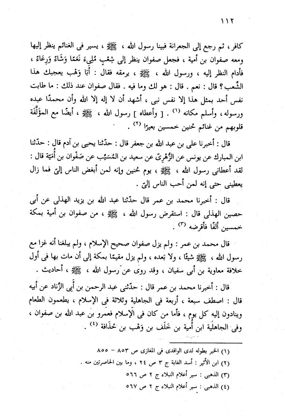 كافر، ثم رجع إلى الجعرانة فبينا رسول الله، - صلى الله عليه وسلم -، يسير في الغنائم ينظر إليها ومعه صفوان بن أمية، فجعل صفوان ينظر إلى شِغبٍ مُلئَ نَعَمًا وَشَاءً وَرِعَاءً، فأدام النظر إليه، ورسول الله، - صلى الله عليه وسلم -، يرمقه فقال: أَبَا وَهْب يعجبك هذا الشِّعب؟ قال: نعم. قال: هو لك وما فيه. فقال صفوان عند ذلك: ما طابت نفس أحد بمثل هذا إلا نفس نبى، أشهد أن لا إله إلا الله وأن محمدًا عبده ورسوله، وأسلم مكانه (¬١) [وأعطاه] رسول الله، - صلى الله عليه وسلم -، أيضًا مع المؤَلَّفَة قلوبهم من غنائم حُنين خمسين بعيرًا (¬٢).