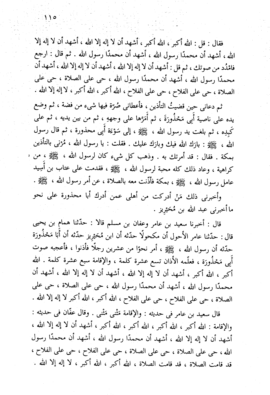 قال: أخبرنا سعيد بن عامر وعفان بن مسلم قالا: حدّثنا همام بن يحيى قال: حدّثنا عامر الأحول أن مكحولًا حدّثه أن ابن مُحَيْرِيز حدّثه أن أبَا مَحْذُورَة حدّثه أن رسول الله، - صلى الله عليه وسلم -، أمر نحوًا من عشرين رجلًا فأذنوا، فأعجبه صوت أَبِي مَحْذُورَة، فعلّمه الأذان تسع عشرة كلمة، والإقامة سبع عشرة كلمة. الله أكبر، الله أكبر، أشهد أن لا إله إلا الله، أشهد أن لا إله إلا الله، أشهد أن محمدًا رسول الله، أشهد أن محمدًا رسول الله، حي على الصلاة، حي على الصلاة، حي على الفلاح، حي على الفلاح، الله أكبر، الله أكبر لا إله إلا الله.