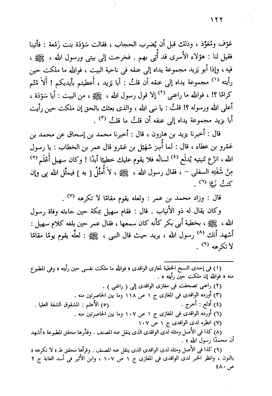 (¬١) في إحدى النسخ الخطية لمغازى الواقدي "فوالله ما ملكت نفسى حين رأيته" وفى المطبوع منه "فوالله إن ملكت حين رأيته".