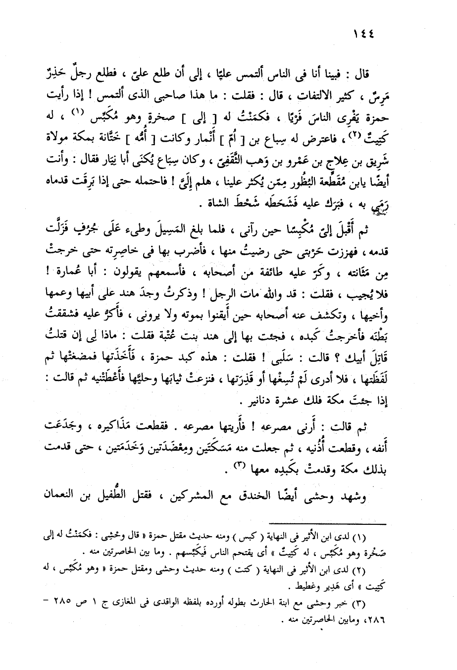 ثم أَقْبلَ إلى مُكْبِسًا حين رآنى، فلما بلغ المَسِيلَ وطئ عَلَى جُرُفٍ فَزَلَّت قدمه، فهززت حَرْبتى حتى رضيتُ منها، فأضرب بها في خاصِرِته حتى خرجتْ مِن مَثَانته، وكَرّ عليه طائفة من أصحابه، فأسمعهم يقولون: أبا عُمارة! فلا يُجيب، فقلت: قد والله مات الرجل -! وذكرتُ وجدَ هند على أبيها وعمها وأخيها، وتكشف عنه أصحابه حين أَيقنوا بموته ولا يرونى، فأَكرُّ عليه فشققتُ بَطْنَه فأخرجتُ كَبده، فجئت بها إلى هند بنت عُتْبة فقلت: ماذا لي إن قتلتُ قَاتِلَ أبيك؟ قالت: سَلَبى! فقلت: هذه كبد حمزة، فَأَخَذَتها فمضغتْها ثم لَفَظتها، فلا أدرى لَمْ تُسِغْها أو قَذِرَتها، فنزعتْ ثيابَها وحليَّها فأَعْطَتْنيه ثم قالت: إذا جئتَ مكة فلك عشرة دنانير.