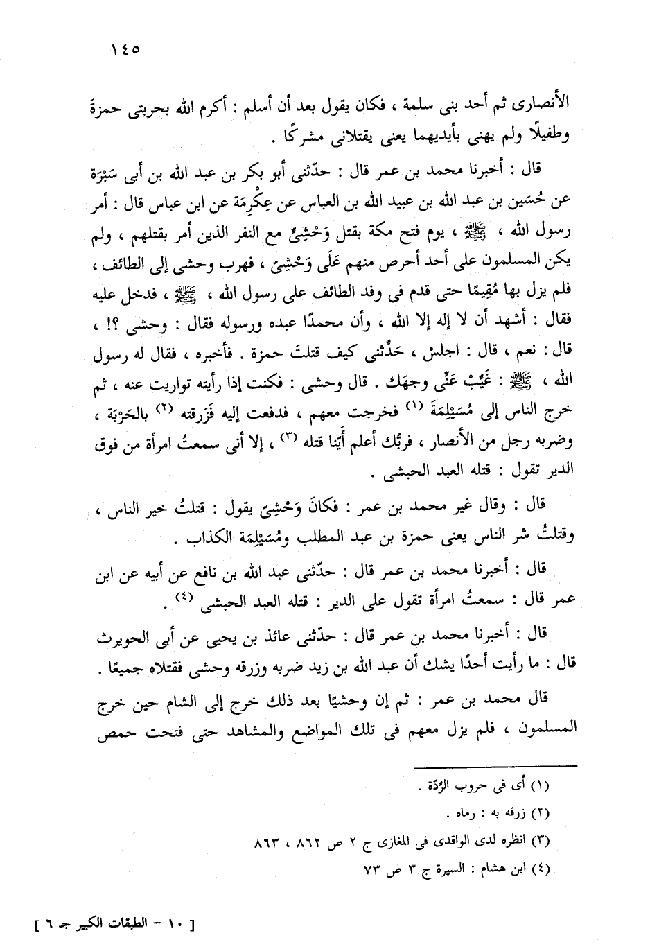 قال: وقال غير محمد بن عمر: فكانَ وَحْشِيّ يقول: قتلتُ خير الناس، وقتلتُ شر الناس يعني حمزة بن عبد المطلب ومُسَيْلِمَة الكذاب.