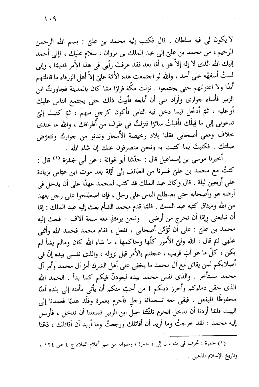 لا يكون لى فيه سلطان. قال فكتب إليه محمّد بن عليّ: بِسْمِ اللَّهِ الرَّحْمَنِ الرَّحِيمِ، من محمّد بن عليّ إلى عبد الملك بن مروان، سلام عليك، فإنى أحمد إليك الله الذى لا إله إِلَّا هو، أمّا بعد فقد عرفتَ رأيى في هذا الأمر قديمًا، وإنى لستُ أسفهُه على أحد، والله لو اجتمعت هذه الأمّة على إِلَّا أهل الزرقاء ما قاتلتهم أبدًا ولا اعتزلتهم حتّى يجتمعوا. نزلت مكّة فرارًا ممّا كان بالمدينة فجاورتُ ابن الزبير فأساء جوارى وأراد منى أن أبايعه فأبيتُ ذلك حتّى يجتمع النَّاس عليك أوعليه، ثمّ أدخُل فيما دخل فيه النَّاس فأكون كرجلٍ منهم، ثمّ كتبتَ إليّ تدعونى إلى ما قِبلَك فأقبلتُ سائرًا فنزلتُ في طرف من أطرافك، والله ما عندى خلاف ومعى أصحابي فقلنا بلاد رخيصة الأسعار وندنو من جوارك ونتعرّض صلتك. فكتبتَ بما كتبت به ونحن منصرفون عنك إن شاء الله.