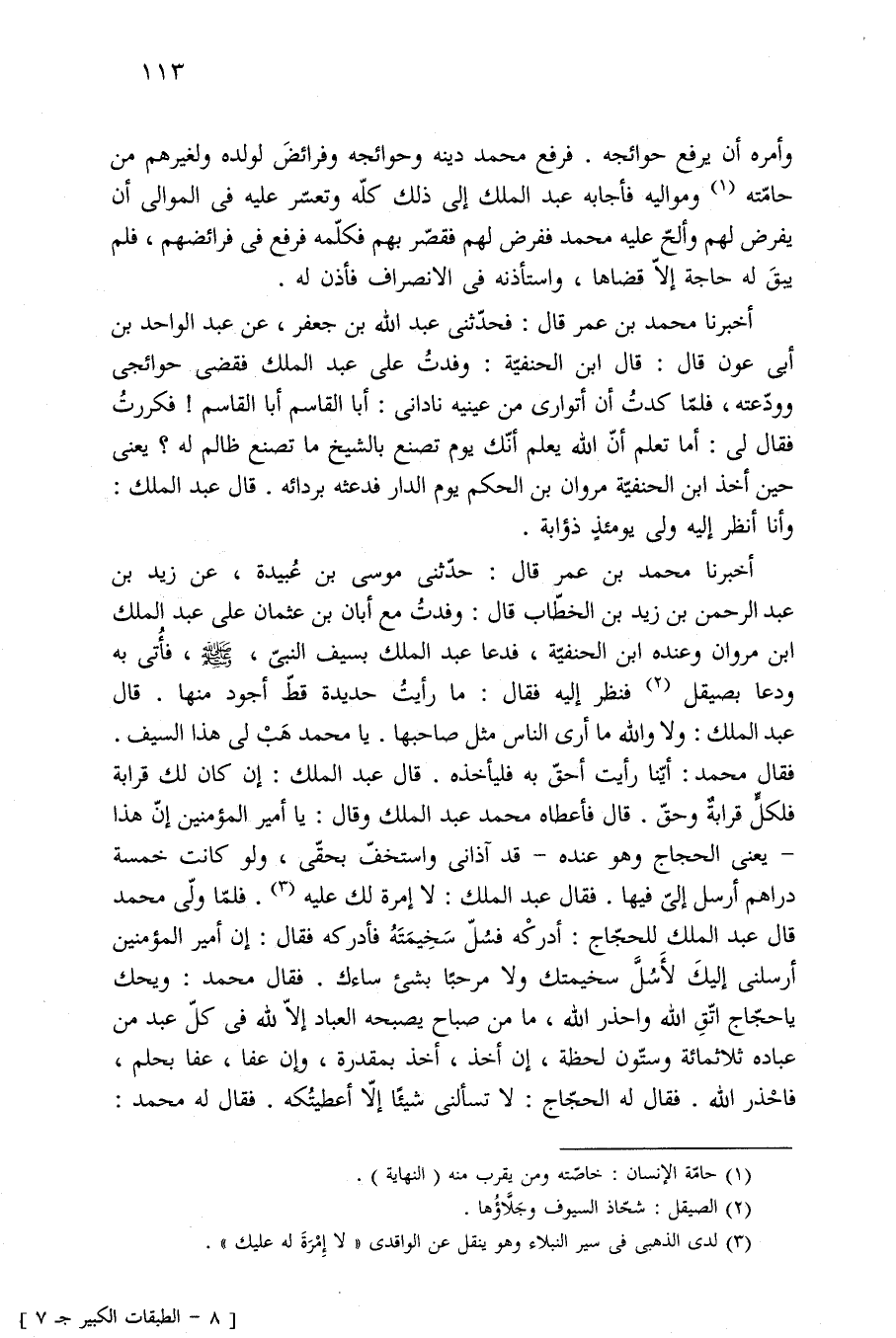 أخبرنا محمّد بن عمر قال: حدَّثَنِى موسى بن عُبيدة، عن زيد بن عبد الرحمن بن زيد بن الخطّاب قال: وفدتُ مع أبان بن عثمان على عبد الملك بن مروان وعنده ابن الحنفيّة، فدعا عبد الملك بسيف النبيّ، - صلى الله عليه وسلم -، فأُتى به ودعا بصيقل (¬٢) فنظر إليه فقال: ما رأيتُ حديدة قطّ أجود منها. قال عبد الملك: ولا والله ما أرى النَّاس مثل صاحبها. يا محمّد هَبْ لى هذا السيف. فقال محمّد: أيّنا رأيت أحقّ به فليأخذه. قال عبد الملك: إن كان لك قرابة فلكلٍّ قرابة وحقّ. قال فأعطاه محمّد عبد الملك وقال: يا أمير المؤمنين إنّ هذا - يعنى الحجاج وهو عنده - قد آذانى واستخفّ بحقّى، ولو كانت خمسة دراهم أرسل إليَّ فيها. فقال عبد الملك: لا إمرة لك عليه (¬٣). فلمّا ولّى محمّد قال عبد الملك للحجّاج: أدركْه فسُلّ سَخِيمَتَهُ فأدركه فقال: إن أمير المؤمنين أرسلنى إليكَ لأَسُلَّ سخيمتك ولا مرحبًا بشيء ساءك. فقال محمّد: ويحك يا حجّاج اتّقِ الله واحذر الله، ما من صباح يصبحه العباد إِلَّا لله في كلّ عبد من عباده ثلاثمائة وستّون لحظة، إن أخذ، أخذ بمقدرة، وإن عفا، عفا بحلم، فاحْذر الله. فقال له الحجّاج: لا تسألنى شيئًا إلّا أعطيتُكه. فقال له محمّد: