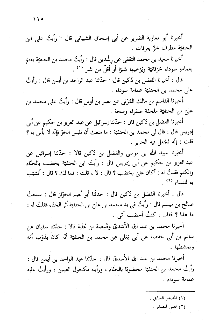 قال: أخبرنا الفضل بن دُكين قال: حدّثنا عبد الواحد بن أيمن قال: رأيتُ على محمّد بن الحنفيّة عمامة سوداء.