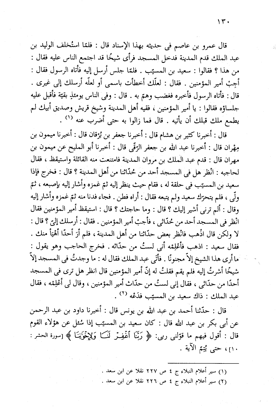 قال: أخبرنا كثير بن هشام قال: أخبرنا جعفر بن بُرْقان قال: أخبرنا ميمون بن مِهْران قال: أخبرنا عبد الله بن جعفر الرّقّى قال: أخبرنا أبو المليح عن ميمون بن مهران قال: قدم عبد الملك بن مروان المدينة فامتنعت منه القائلة واستيقظ، فقال لحاجبه: انْظر هل في المسجد أحد من حُدّاثنا من أهل المدينة؟ قال: فخرج فإذا سعيد بن المُسَيَّب في حلقة له، فقام حيث ينظر إليه ثمَّ غمزه وأشار إليه بإصبعه، ثمّ ولّى، فلم يتحرّك سعيد ولم يتبعه فقال: أراه فطن. فجاء فدنا منه ثمّ غمزه وأشار إليه وقال: ألم ترنى أشير إليك؟ قال: وما حاجتك؟ قال: استيقظ أمير المؤمنين فقال انْظر في المسجد أحد من حُدّاثى، فأجبْ أمير المؤمنين، فقال: أرسلك إليّ؟ قال: لا ولكن قال اذْهب فانْظر بعض حدّاثنا من أهل المدينة، فلم أرَ أحدًا أهْيَأ منك. فقال سعيد: اذهب فأعْلِمْه أنى لستُ من حدّاثه. فخرج الحاجب وهو يقول: ما أرى هذا الشيخ إِلَّا مجنونًا. فأتَى عبد الملك فقال له: ما وجدتُ في المسجد إِلَّا شيخًا أشرتُ إليه فلم يقم فقلتُ له إنّ أمير المؤمنين قال انظر هل ترى في المسجد أحدًا من حدّاثى، فقال إنى لستُ من حدّاث أمير المؤمنين، وقال لى أعْلِمْه، فقال عبد الملك: ذاك سعيد بن المُسَيَّب فدَعْه (¬٢).