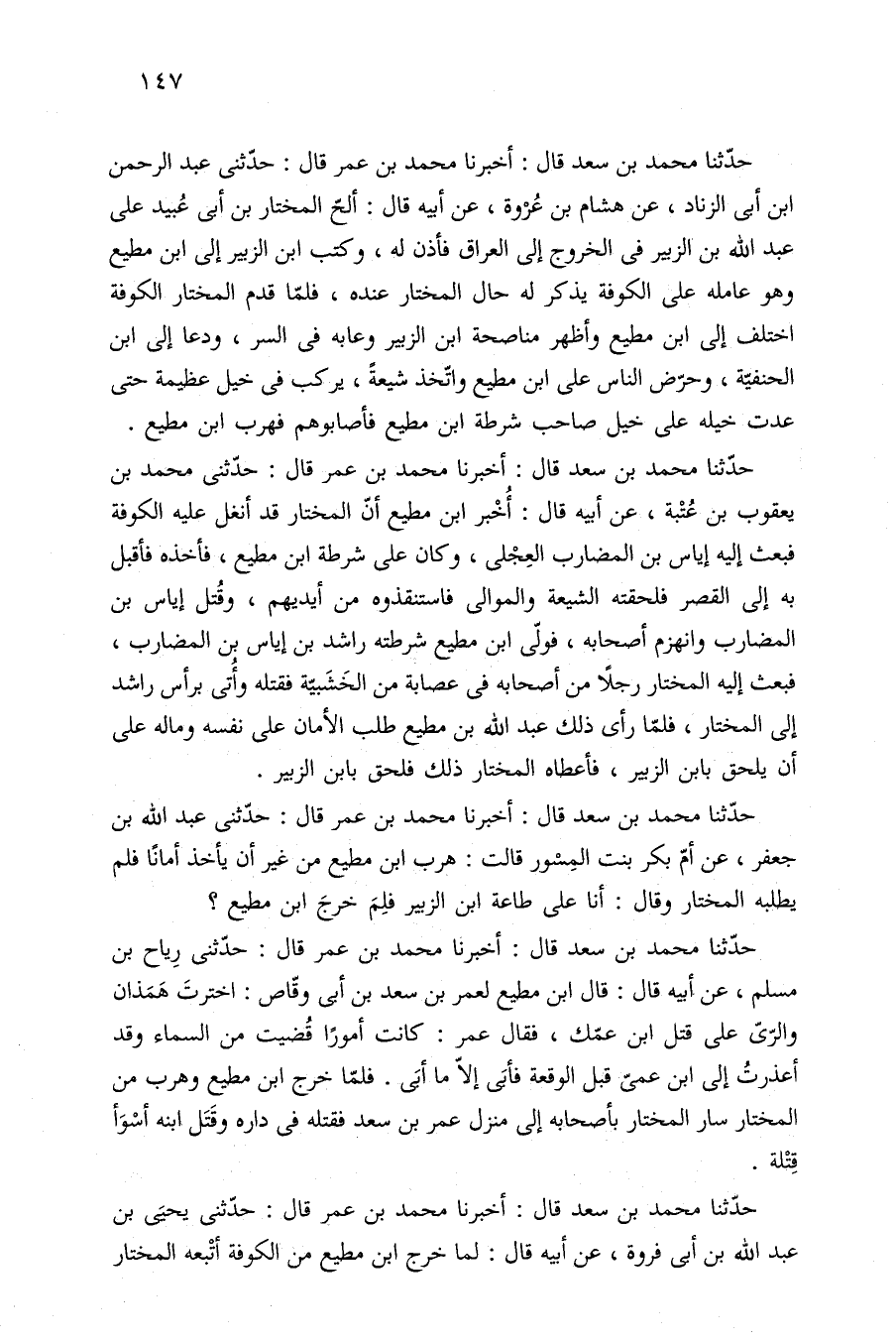 حدّثنا محمد بن سعد قال: أخبرنا محمد بن عمر قال: حدّثني عبد الله بن جعفر، عن أمّ بكر بنت المِسْور قالت: هرب ابن مطيع من غير أن يأخذ أمانًا فلم يطلبه المختار وقال: أنا على طاعة ابن الزبير فلِمَ خرجَ ابن مطيع؟