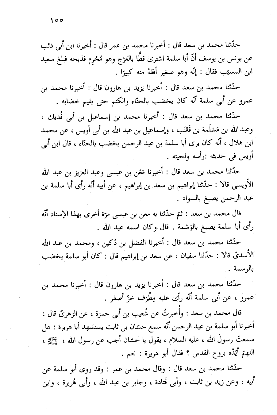 حدّثنا محمد بن سعد قال: أخبرنا الفضل بن دُكين، ومحمد بن عبد الله الأسديّ قالا: حدّثنا سفيان، عن سعد بن إبراهيم قال: كان أبو سلمة يخضب بالوسمة.
