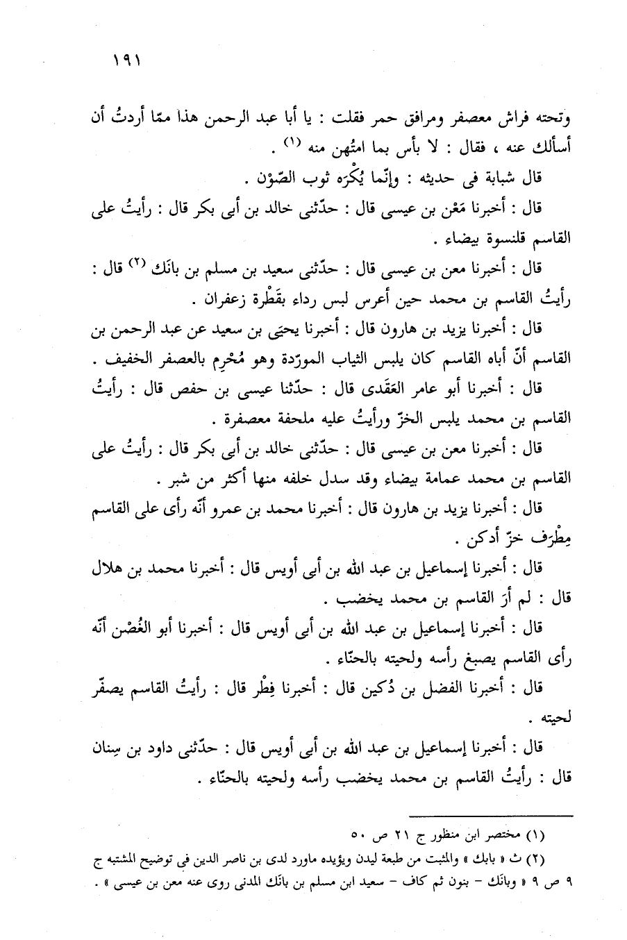 قال: أخبرنا الفضل بن دُكين قال: أخبرنا فِطْر قال: رأيتُ القاسم يصفّر لحيته.