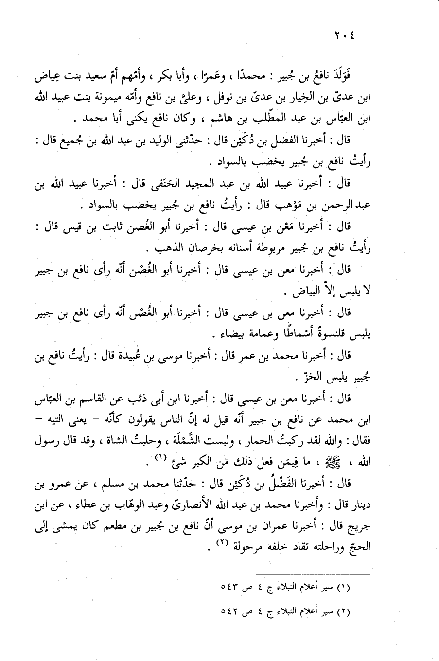 قال: أخبرنا الفَضْلُ بن دُكَيْن قال: حدّثنا محمد بن مسلم، عن عمرو بن دينار قال: وأخبرنا محمد بن عبد الله الأنصاريّ وعبد الوهّاب بن عطاء، عن ابن جريج قال: أخبرنا عمران بن موسى أنّ نافع بن جُبير بن مطعم كان يمشى إلى الحجّ وراحلته تقاد خلفه مرحولة (¬٢).