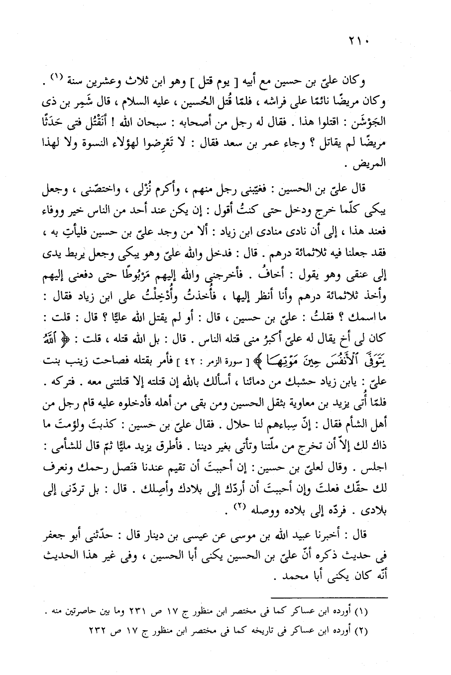 قال عليّ بن الحسين: فغيّبنى رجل منهم، وأكرم نُزْلى، واختصّنى، وجعل يبكى كلّما خرج ودخل حتى كنتُ أقول: إن يكن عند أحد من الناس خير ووفاء فعند هذا، إلى أن نادى منادى ابن زياد: ألا من وجد عليّ بن حسين فليأتِ به، فقد جعلنا فيه ثلاتمائة درهم. قال: فدخل والله عليّ وهو يبكى وجعل يربط يدى إلى عنقى وهو يقول: أخافُ. فأخرجنى والله إليهم مَرْبُوطًا حتى دفعنى إليهم وأخذ ثلاثمائة درهم وأنا أنظر إليها، فأُخذتُ وأُدْخِلْتُ على ابن زياد فقال: ما اسمك؟ فقلتُ: عليّ بن حسين، قال: أو لم يقتل الله عليًّا؟ قال: قلت: كان لى أخ يقال له عليّ أكبرُ منى قتله الناس. قال: بل الله قتله، قلت: {اللَّهُ يَتَوَفَّى الْأَنْفُسَ حِينَ مَوْتِهَا} [سورة الزمر: ٤٢] فأمر بقتله فصاحت زينب بنت عليّ. يابن زياد حسْبك من دمائنا، أسألك بالله إن قتلته إلا قتلتنى معه. فتركه. فلمّا أُتى يزيد بن معاوية بثقل الحسين ومن بقى من أهله فأدخلوه عليه قام رجل من أهل الشأم فقال: إنّ سِباءهم لنا حلال. فقال عليّ بن حسين: كذبتَ ولؤمتَ ما ذاك لك إلّا أن تخرج من ملّتنا وتأتى بغير ديننا. فأطرق يزيد مليًّا ثمّ قال للشأمى: اجلس. وقال لعليّ بن حسين: إن أحببتَ أن تقيم عندنا فنَصل رحمك ونعرف لك حقّك فعلتَ وإن أحببتَ أن أردّك إلى بلادك وأصِلك. قال: بل تردّنى إلى بلادى. فردّه إلى بلاده ووصله (¬٢).