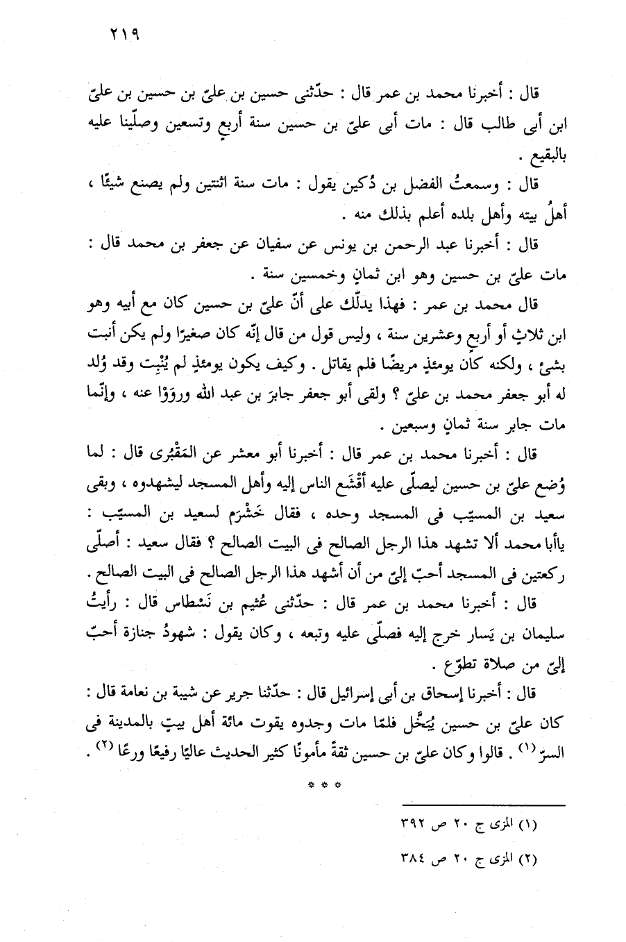 قال: أخبرنا إسحاق بن أبي إسرائيل قال: حدّثنا جرير عن شيبة بن نعامة قال: كان عليّ بن حسين يُبَخَّل فلمّا مات وجدوه يقوت مائة أهل بيت بالمدينة في السرّ (¬١). قالوا وكان عليّ بن حسين ثقهً مأمونًا كثير الحديث عاليًا رفيعًا ورعًا (¬٢).