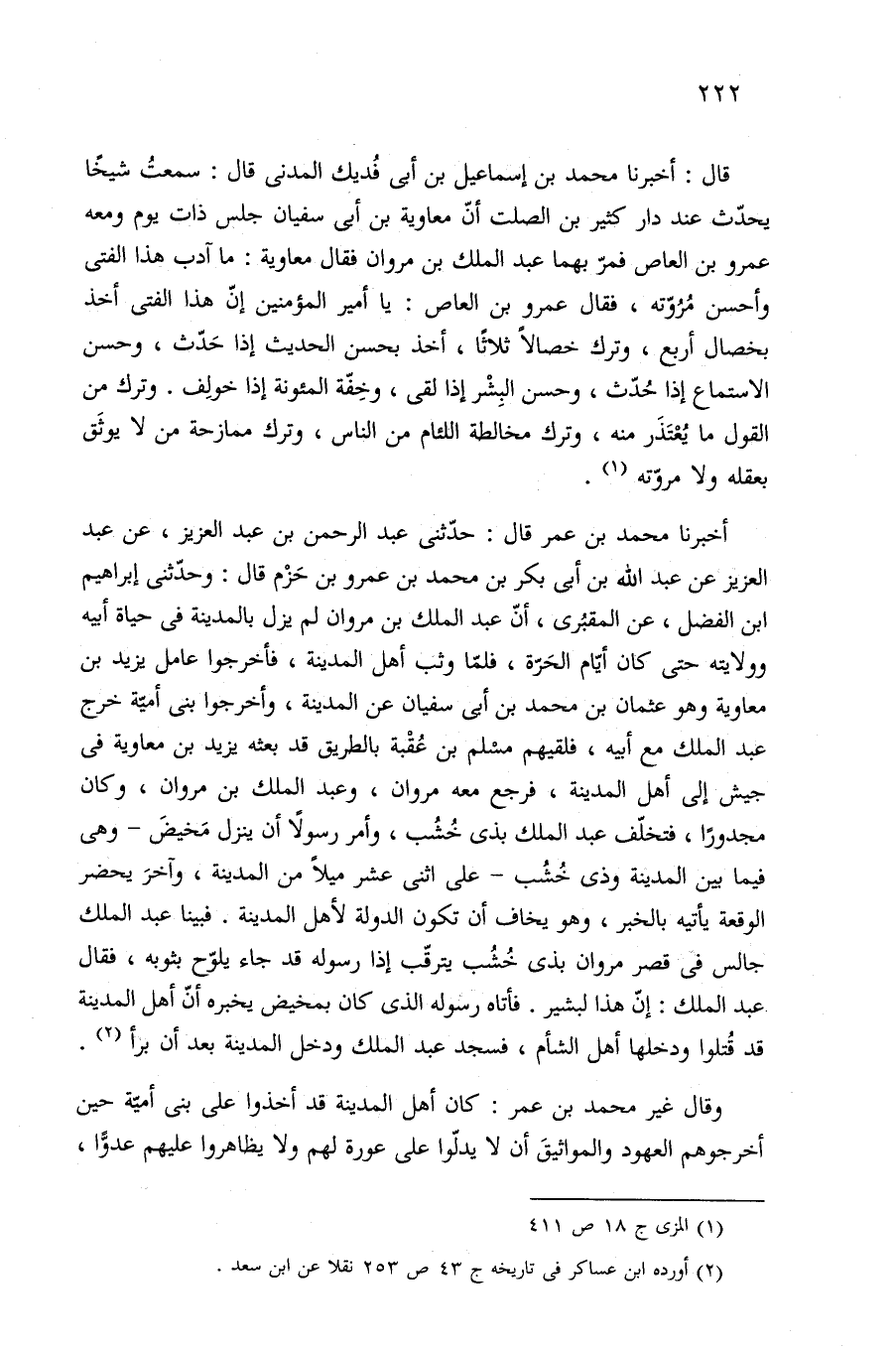 قال: أخبرنا محمد بن إسماعيل بن أبي فُديك المدنى قال: سمعتُ شيخًا يحدّث عند دار كثير بن الصلت أنّ معاوية بن أبي سفيان جلس ذات يوم ومعه عمرو بن العاص فمرّ بهما عبد الملك بن مروان فقال معاوية: ما آدب هذا الفتى وأحسن مُرُوّته، فقال عمرو بن العاص: يا أمير المؤمنين إنّ هذا الفتى أخذ بخصال أربع، وترك خصالًا ثلاثًا، أخذ بحسن الحديث إذا حَدّث، وحسن الاستماع إذا حُدّث، وحسن البِشْر إذا لقى، وخِفّة المئونة إذا خولِف. وترك من القول ما يُعْتَذَر منه، وترك مخالطة النئام من الناس، وترك ممازحة من لا يوثَق بعقله ولا مروّته (¬١).