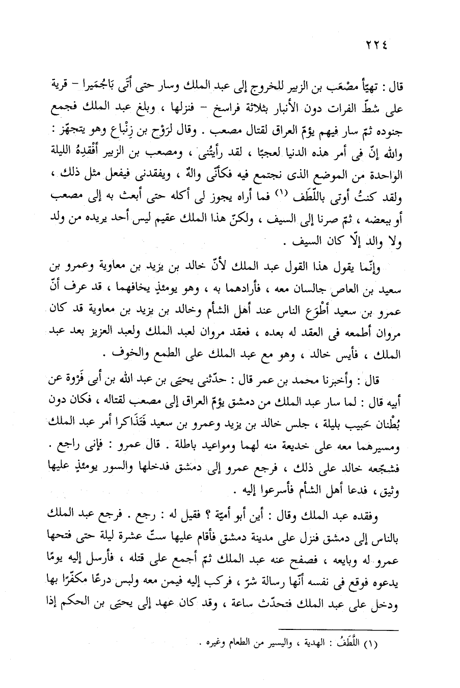 وإنّما يقول هذا القول عبد الملك لأنّ خالد بن يزيد بن معاوية وعمرو بن سعيد بن العاص جالسان معه، فأرادهما به، وهو يومئذٍ يخافهما، قد عرف أنّ عمرو بن سعيد أطْوَع الناس عند أهل الشأم وخالد بن نريد بن معاوية قد كان مروان أطمعه في العقد له بعده، فعقد مروان لعبد الملك ولعبد العزيز بعد عبد الملك، فأيس خالد، وهو مع عبد الملك على الطمع والخوف.