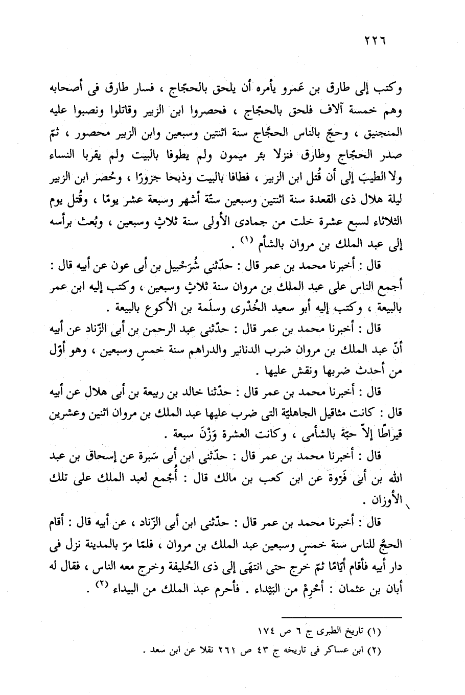 قال: أخبرنا محمد بن عمر قال: حدّثنى عبد الرحمن بن أبي الزناد عن أبيه أنّ عبد الملك بن مروان ضرب الدنانير والدراهم سنة خمسٍ وسبعين، وهو أوّل من أحدث ضربها ونقش عليها.