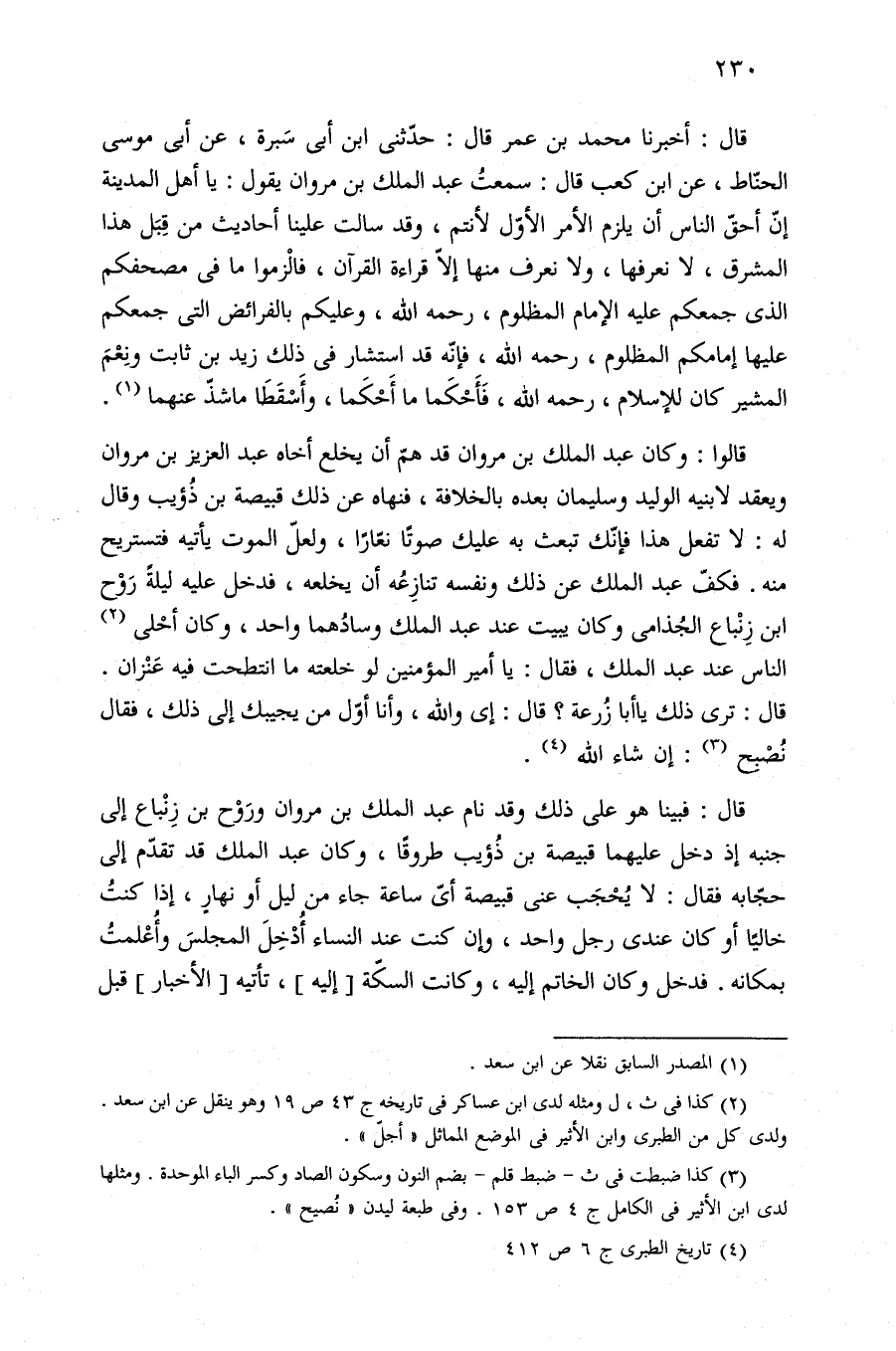 قال: أخبرنا محمد بن عمر قال: حدّثنى ابن أبي سَبرة، عن أبي موسى الحنّاط، عن ابن كعب قال: سمعتُ عبد الملك بن مروان يقول: يا أهل المدينة إنّ أحقّ الناس أن يلزم الأمر الأوّل لأنتم، وقد سالت علينا أحاديث من قِبَل هذا المشرق، لا نعرفها، ولا نعرف منها إلّا قراءة القرآن، فالْزموا ما في مصحفكم الذى جمعكم عليه الإمام المظلوم، رحمه الله، وعليكم بالفرائض التى جمعكم عليها إمامكم المظلوم، رحمه الله، فإنّه قد استشار في ذلك زيد بن ثابت ونِعْمَ المشير كان للإسلام، رحمه الله، فَأَحْكَما ما أَحْكَما، وأَسْقَطَا ما شذّ عنهما (¬١).
