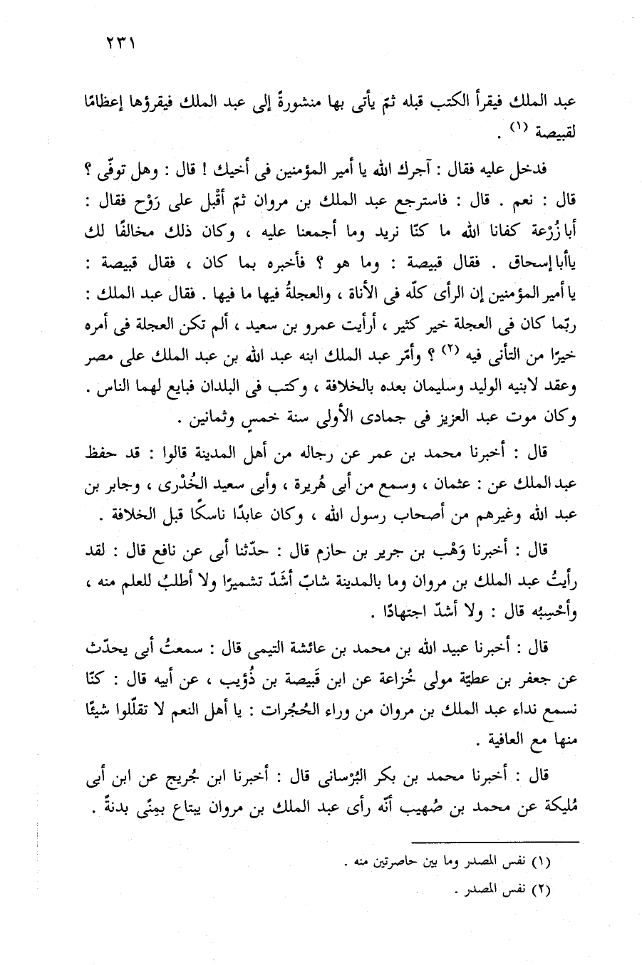 قال: أخبرنا عبيد الله بن محمد بن عائشة التيمى قال: سمعتُ أبي يحدّث عن جعفر بن عطيّة مولى خُزاعة عن ابن قَبيصة بن ذُؤيب، عن أبيه قال: كنّا نسمع نداء عبد الملك بن مروان من وراء الحُجُرات: يا أهل النعم لا تقلّلوا شيئًا منها مع العافية.