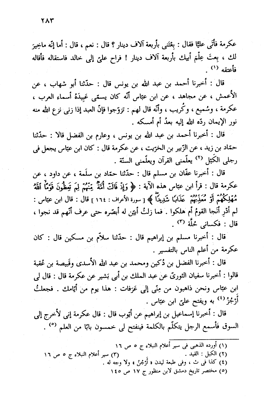 قال: أخبرنا مسلم بن إبراهيم قال: حدّثنا سلّام بن مسكين قال: كان عكرمة من أعلم الناس بالتفسير.