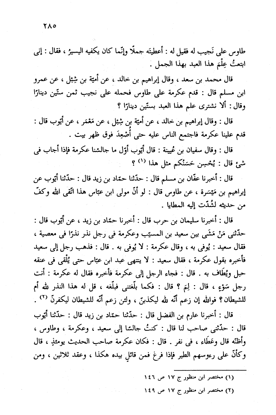 قال: أخبرنا عفّان بن مسلم قال: حدّثنا حمّاد بن زيد قال: حدّثنا أيّوب عن إبراهيم بن مَيْسَرة، عن طاوس قال: لو أنّ مولى ابن عبّاس هذا اتّقى الله وكفّ من حديثه لشُدّت إليه المطايا.