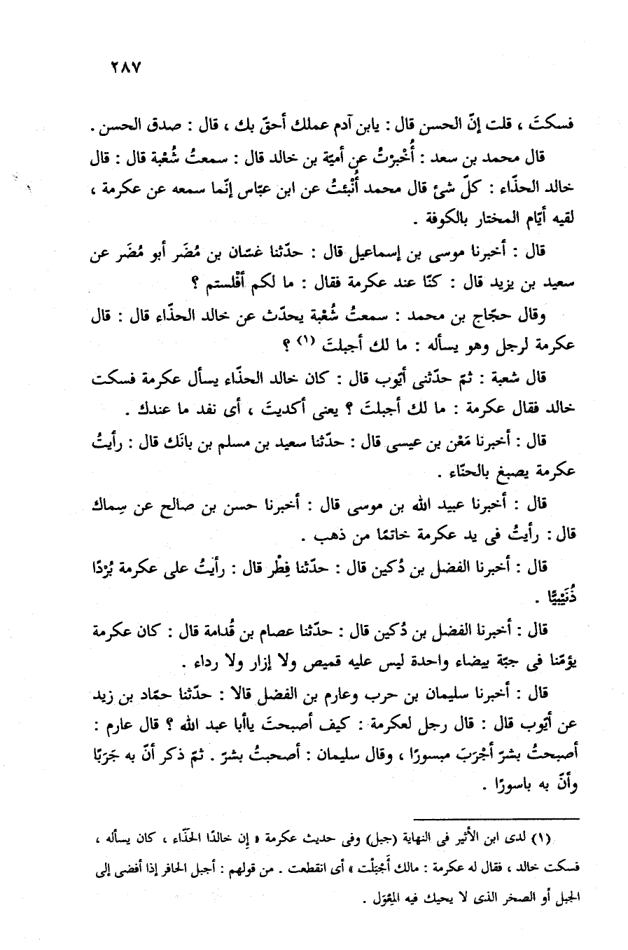 وقال حجّاج بن محمد: سمعتُ شُعْبة يحدّث عن خالد الحذّاء قال: قال عكرهة لرجل وهو يسأله: ما لك أجبلتَ (¬١)؟