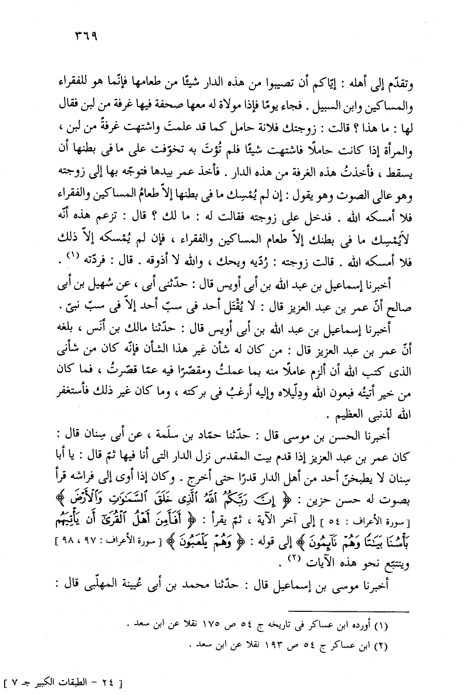 أخبرنا الحسن بن موسى قال: حدّثنا حمّاد بن سلَمة، عن أبي سِنان قال: كان عمر بن عبد العزيز إذا قدم بيت المقدس نزل الدار التي أنا فيها ثمّ قال: يا أبا سِنان لا يطبخنّ أحد من أهل الدار قدرًا حتى أخرج. وكان إذا أوى إلى فراشه قرأ بصوت له حسن حزين: {إِنَّ رَبَّكُمُ اللَّهُ الَّذِي خَلَقَ السَّمَاوَاتِ وَالْأَرْضَ} [سورة الأعراف: ٥٤] إلى آخر الآية، ثمّ يقرأ: {أَفَأَمِنَ أَهْلُ الْقُرَى أَنْ يَأْتِيَهُمْ بَأْسُنَا بَيَاتًا وَهُمْ نَائِمُونَ} إلى قوله: {وَهُمْ يَلْعَبُونَ} [سورة الأعراف: ٩٧, ٩٨] ويتتبّع نحو هذه الآيات (¬٢).