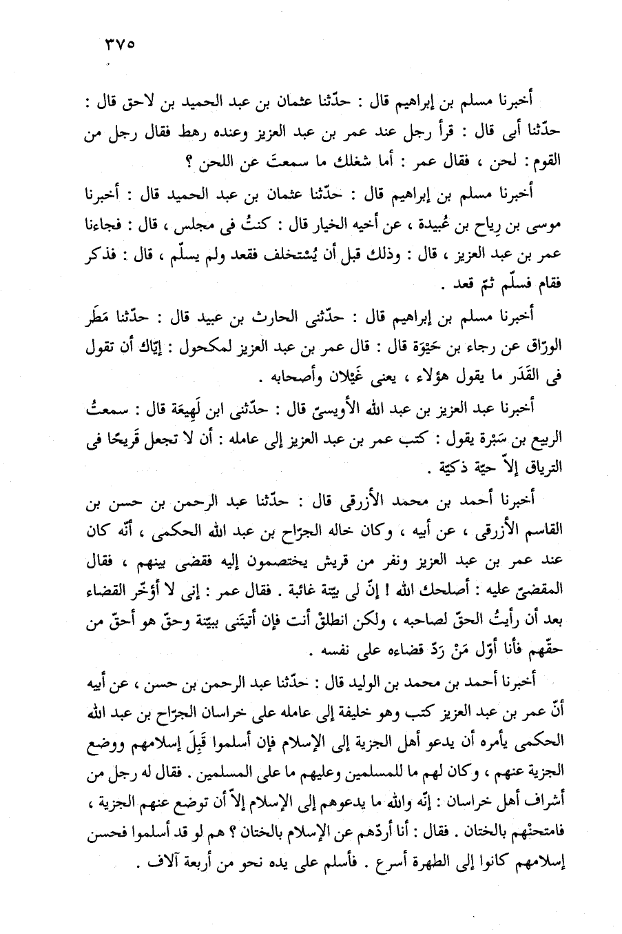 أخبرنا أحمد بن محمد بن الوليد قال: حدّثنا عبد الرحمن بن حسن، عن أبيه أنّ عمر بن عبد العزيز كتب وهو خليفة إلى عامله على خراسان الجرّاح بن عبد الله الحكمى يأمره أن يدعو أهل الجزية إلى الإسلام فإن أسلموا قَبِلَ إسلامهم ووضع الجزية عنهم، وكان لهم ما للمسلمين وعليهم ما على المسلمين. فقال له رجل من أشراف أهل خراسان: إنّه والله ما يدعوهم إلى الإسلام إلّا أن توضع عنهم الجزية، فامتحنْهم بالختان. فقال: أنا أردّهم عن الإسلام بالختان؟ هم لو قد أسلموا فحسن إسلامهم كانوا إلى الطهرة أسرع. فأسلم على يده نحو من أربعة آلاف.