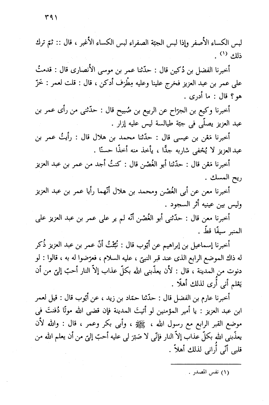 أخبرنا إسماعيل بن إبراهيم عن أيّوب قال: نُبِّئْتُ أنّ عمر بن عبد العزيز ذُكر له ذاك الموضع الرابع الذي عند قبر النبيّ، عليه السلام، فعرّضوا له به، قالوا: لو دنوت من المدينة، قال: لأن يعذّبنى الله بكلّ عذاب إلّا النار أحبّ إلىّ من أن يَعْلم أنى أُرى لذلك أهلًا.