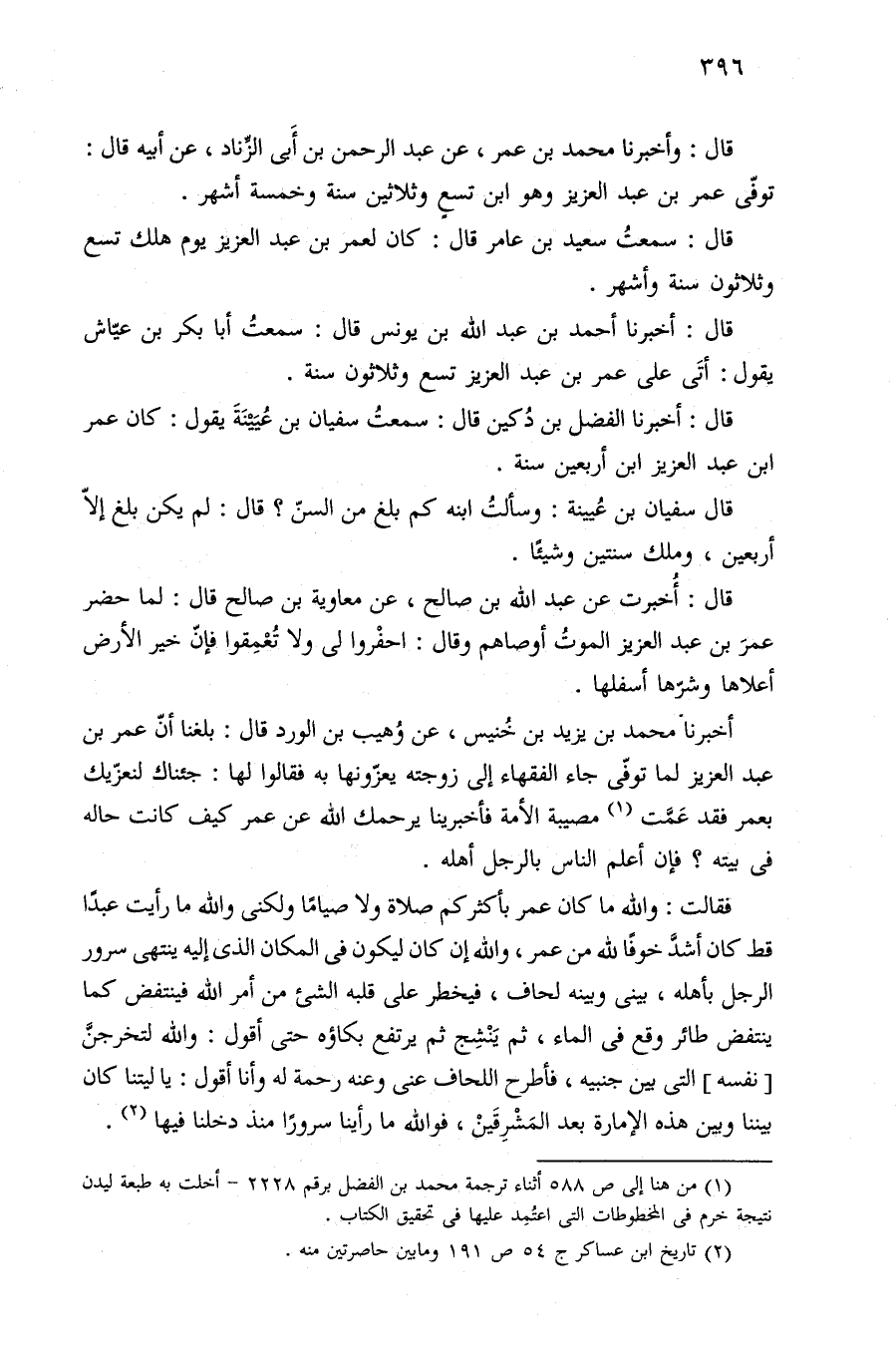 قال: وأخبرنا محمد بن عمر، عن عبد الرحمن بن أَبى الزِّناد، عن أبيه قال: توفّى عمر بن عبد العزيز وهو ابن تسعٍ وثلاثين سنة وخمسة أشهر.