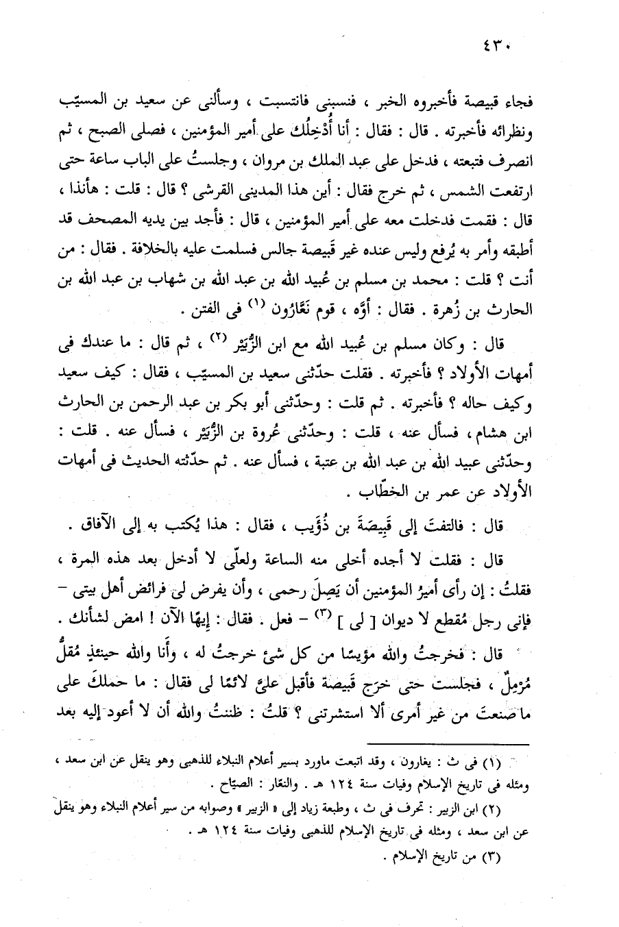 فجاء قبيصة فأخبروه الخبر، فنسبنى فانتسبت، وسألنى عن سعيد بن المسيّب ونظرائه فأخبرته. قال: فقال: أنا أُدْخِلُك على أمير المؤمنين، فصلى الصبح، ثم انصرف فتبعته، فدخل على عبد الملك بن مروان، وجلستُ على الباب ساعة حتى ارتفعت الشمس، ثم خرج فقال: أين هذا المديني القرشي؟ قال: قلت: هأنذا، قال: فقمت فدخلت معه على أمير المؤمنين، قال: فأجد بين يديه المصحف قد أطبقه وأمر به يُرفع وليس عنده غير قَبيصة جالس فسلمت عليه بالخلافة. فقال: من أنت؟ قلت: محمد بن مسلم بن عُبيد الله بن عبد الله بن شهاب بن عبد الله بن الحارث بن زُهرة. فقال: أوَّه، قوم نَعَّارُون (¬١) في الفتن.