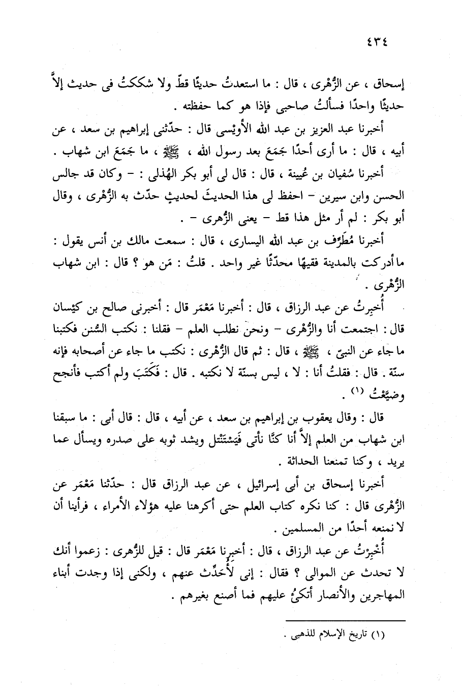 إسحاق، عن الزُّهْرى، قال: ما استعدتُ حديثًا قطّ ولا شككتُ في حديث إلَّا حديثًا واحدًا فسألتُ صاحبى فإذا هو كما حفظته.