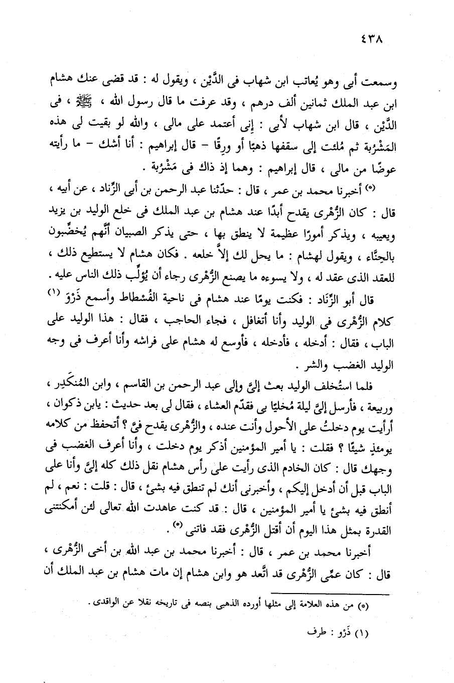 قال أبو الزِّنَاد: فكنت يومًا عند هشام في ناحية الفُسْطاط وأسمع ذَرْوَ (¬١) كلام الزُّهْرى في الوليد وأنا أتغافل، فجاء الحاجب، فقال: هذا الوليد على الباب، فقال: أدخله، فأدخله، فأوسع له هشام على فراشه وأنا أعرف في وجه الوليد الغضب والشر.