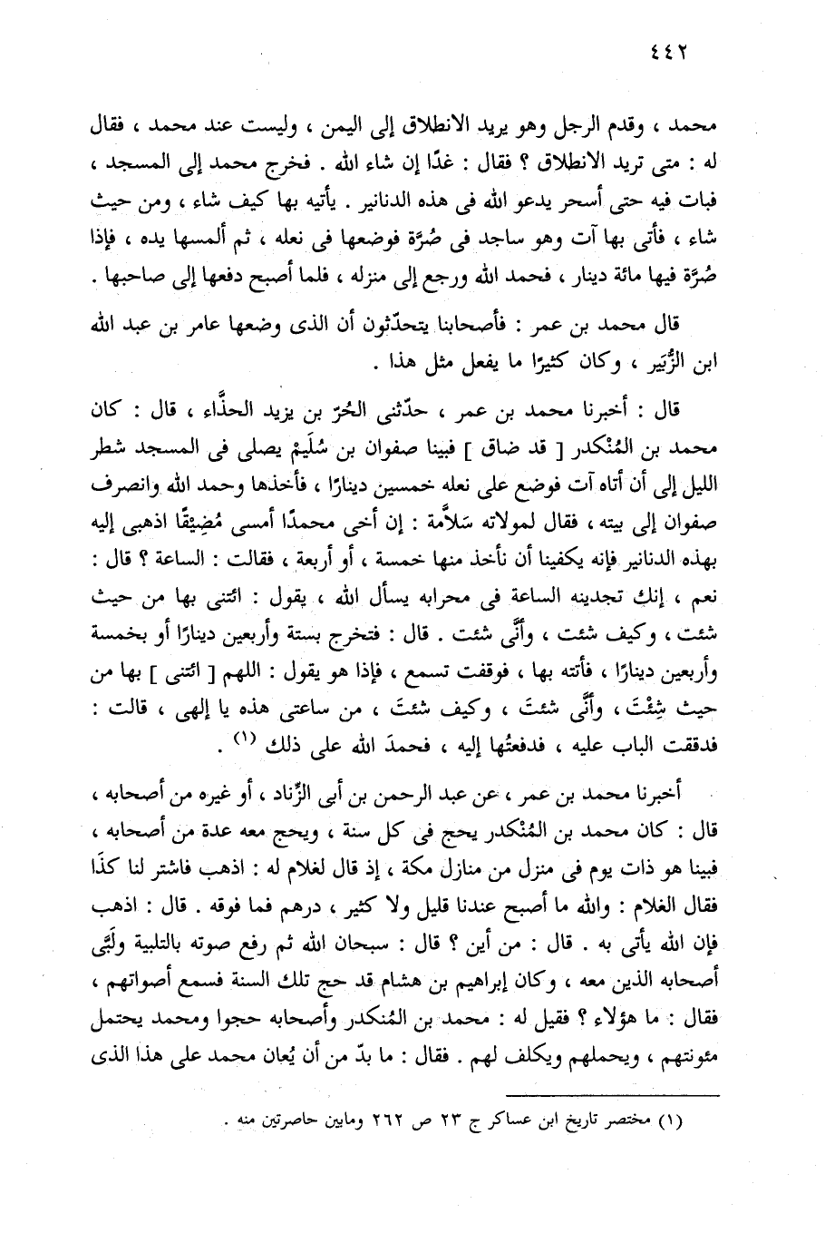 محمد، وقدم الرجل وهو يريد الانطلاق إلى اليمن، وليست عند محمد، فقال له: متى تريد الانطلاق؟ فقال: غدًا إن شاء الله. فخرج محمد إلى المسجد، فبات فيه حتى أسحر يدعو الله في هذه الدنانير. يأتيه بها كيف شاء، ومن حيث شاء، فأتى بها آت وهو ساجد في صُرَّة فوضعها في نعله، ثم ألمسها يده، فإذا صُرَّة فيها مائة دينار، فحمد الله ورجع إلى منزله، فلما أصبح دفعها إلى صاحبها.