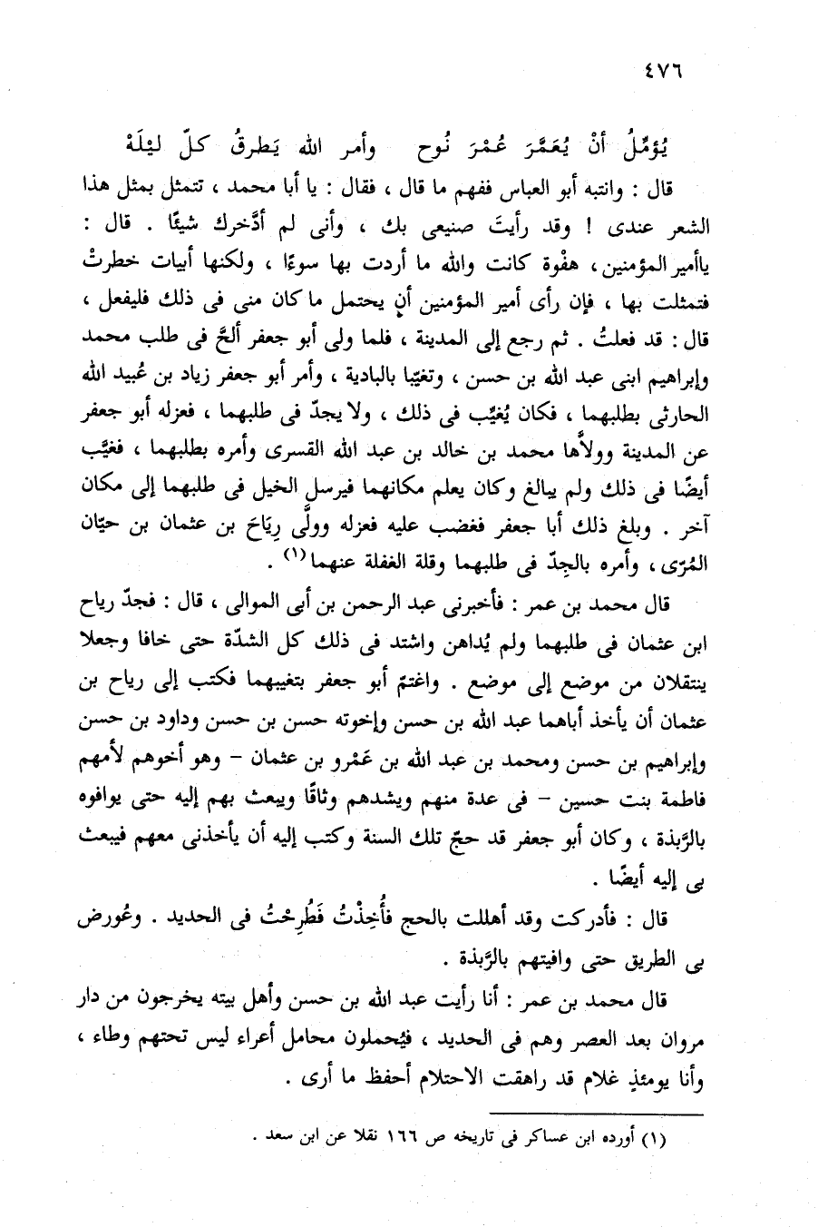 قال: وانتبه أبو العباس ففهم ما قال، فقال: يا أبا محمد، تتمثل بمثل هذا الشعر عندى! وقد رأيتَ صنيعى بك، وأنى لم أدَّخرك شيئًا. قال: يا أمير المؤمنين، هفْوة كانت والله ما أردت بها سوءًا، ولكنها أبيات خطرتْ فتمثلت بها، فإن رأى أمير المؤمنين أن يحتمل ما كان منى في ذلك فليفعل، قال: قد فعلتُ. ثم رجع إلى المدينة، فلما ولى أبو جعفر ألحَّ في طلب محمد وإبراهيم ابنى عبد الله بن حسن، وتغيّبا بالبادية، وأمر أبو جعفر زياد بن عُبيد الله الحارثى بطلبهما، فكان يُغيِّب في ذلك، ولا يجدّ في طلبهما، فعزله أبو جعفر عن المدينة وولَّاها محمد بن خالد بن عبد الله القسرى وأمره بطلبهما، فغيَّب أيضًا في ذلك ولم يبالغ وكان يعلم مكانهما فيرسل الخيل في طلبهما إلى مكان آخر. وبلغ ذلك أبا جعفر فغضب عليه فعزله وولَّى رِيَاحَ بن عثمان بن حيّان المُرّى، وأمره بالجِدّ في طلبهما وقلة الغفلة عنهما (¬١).