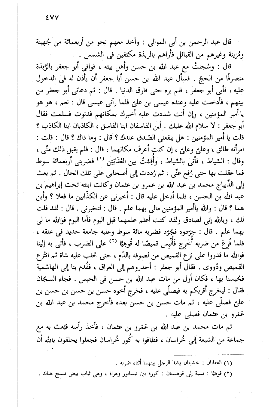 قال: وسُجنتُ مع عبد الله بن حسن وأهل بيته، فوافى أبو جعفر بالرَّبذة منصرفًا من الحجّ. فسأل عبد الله بن حسن أبا جعفر أن يأذن له في الدخول عليه، فأبى أبو جعفر، فلم يره حتى فارق الدنيا. قال: ثم دعانى أبو جعفر من بينهم، فأدخلت عليه وعنده عيسى بن عليّ فلمّا رآنى عيسى قال: نعم، هو هو يا أمير المؤمنين، وإن أنت شددت عليه أخبرك بمكانهم فدنوت فسلمت فقال أبو جعفر: لا سلام الله عليك. أين الفاسقان ابنا الفاسق، الكاذبان ابنا الكاذب؟ قلت يا أمير المؤمنين: هل ينفعنى الصّدق عندك؟ قال: وما ذاك؟ قال: قلت: امرأته طالق، وعليّ وعليّ، إن كنت أعرف مكانهما، قال: فلم يقبل ذلك منِّى، وقال: السِّياط، فأتى بالسِّياط، وأُقِمْتُ بين العُقَابَيْن (¬١) فضربنى أربعمائة سوط فما عقلت بها حتى رُفع عنِّى، ثم رُددت إلى أصحابي على تلك الحال. ثم بعث إلى الدِّيباج محمد بن عبد الله بن عمرو بن عثمان وكانت ابنته تحت إبراهيم بن عبد الله بن الحسن، فلما أدخل عليه قال: أخبرني عن الكذّابين ما فعلا؟ وأين هما؟ قال: والله يا أمير المؤمنين مالى بهما علم. قال: لتخبرنى. قال: لقد قلت لك، وبالله إني لصادق ولقد كنت أعلم علمهما قبل اليوم فأما اليوم فوالله ما لي بهما علم. قال: جرّدوه فجُرّد فضربه مائة سوط وعليه جامعة حديد في عنقه، فلما فُرِغ من ضربه أُخْرِج فَأُلْبِس قميصًا له قُوهِيًّا (¬٢) على الضرب، فأتى به إلينا فوالله ما قدروا على نزع القميص من لصوقه بالدّم، حتى حُلب عليه شاة ثم انتُزع القميص ودُووى. فقال أبو جعفر: أحدروهم إلى العراق، فقُدم بنا إلى الهاشمية فحُبسنا بها، فكان أول من مات عبد الله بن حسن في الحبس. فجاء السجّان فقال: ليخرج أقربكم به فيصلّى عليه، فخرج أخوه حسن بن حسن بن حسن بن عليّ فصلّى عليه، ثم مات حسن بن حسن بعده فأخرج محمد بن عبد الله بن عَمْرو بن عثمان فصلى عليه.