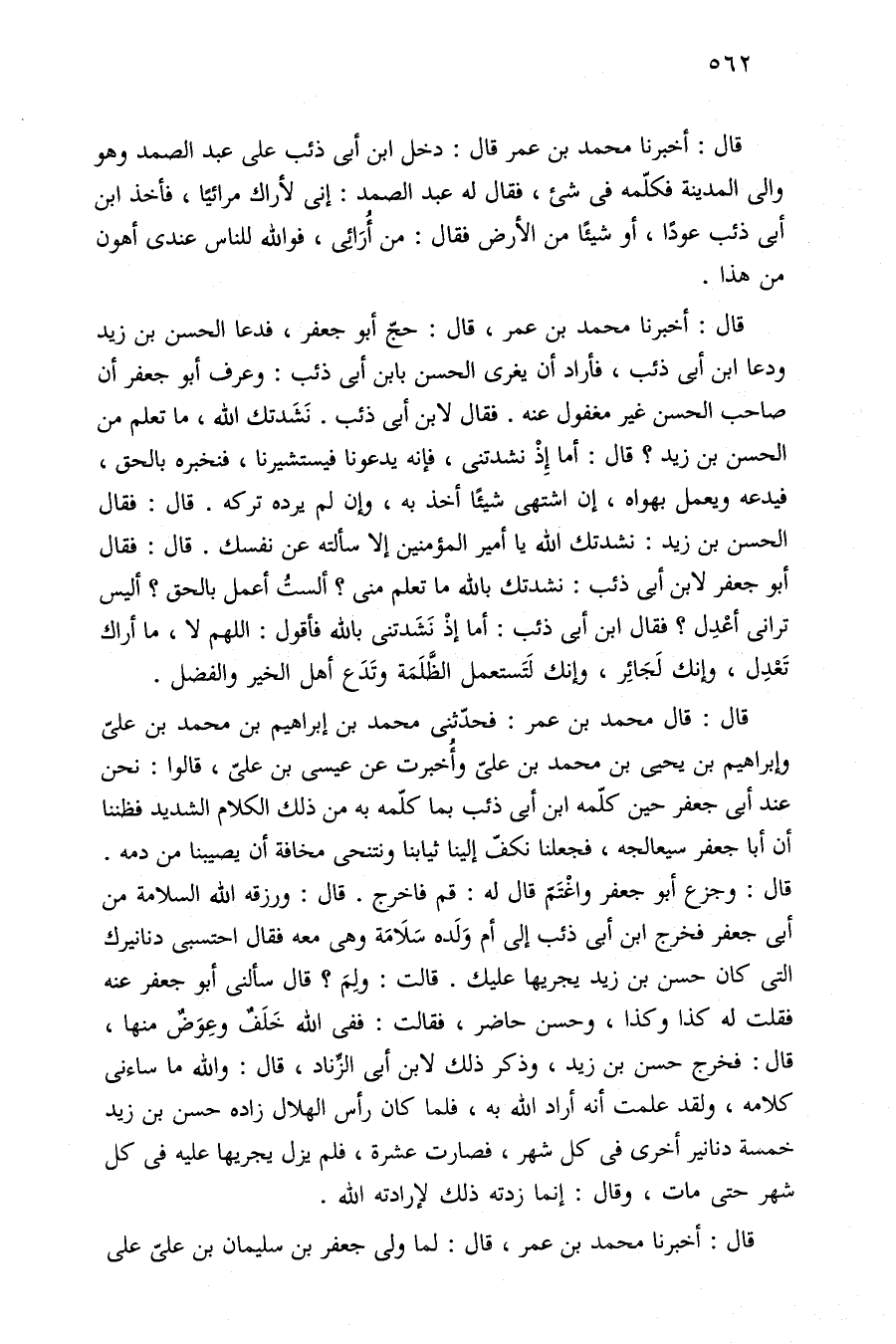 قال: أخبرنا محمد بن عمر، قال: حجّ أبو جعفر، فدعا الحسن بن زيد ودعا ابن أبي ذئب، فأراد أن يغرى الحسن بابن أبي ذئب: وعرف أبو جعفر أن صاحب الحسن غير مغفول عنه. فقال لابن أبي ذئب. نَشَدتك الله، ما تعلم من الحسن بن زيد؟ قال: أما إِذْ نشدتنى، فإنه يدعونا فيستشيرنا، فنخبره بالحق، فيدعه ويعمل بهواه، إن اشتهى شيئًا أخذ به، وإن لم يرده تركه. قال: فقال الحسن بن زيد: نشدتك الله يا أمير المؤمنين إلا سألته عن نفسك. قال: فقال أبو جعفر لابن أبي ذئب: نشدتك بالله ما تعلم مني؟ ألستُ أعمل بالحق؟ أليس ترانى أعْدِل؟ فقال ابن أبي ذئب: أما إذْ نَشَدتنى بالله فأقول: اللهم لا، ما أراك تَعْدِل، وإنك لَجَائِر، وإنك لَتَستعمل الظَّلَمَة وتَدَع أهل الخير والفضل.