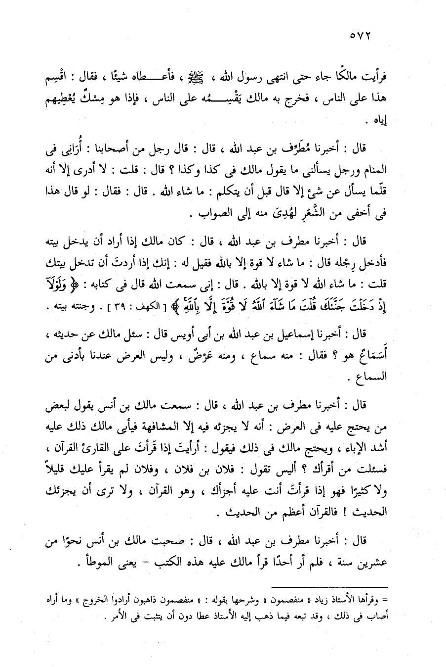 قال: أخبرنا مطرف بن عبد الله، قال: سمعت مالك بن أنس يقول لبعض من يحتج عليه في العرض: أنه لا يجزئه فيه إلا المشافهة فيأبى مالك ذلك عليه أشد الإباء، ويحتج مالك في ذلك فيقول: أرأيتَ إذا قَرأتَ على القارئ القرآن، فسئلت من أقرأك؟ أليس تقول: فلان بن فلان، وفلان لم يقرأ عليك قليلًا ولا كثيرًا فهو إذا قرأتَ أنت عليه أجزأك، وهو القرآن، ولا ترى أن يجزئك الحديث! فالقرآن أعظم من الحديث.