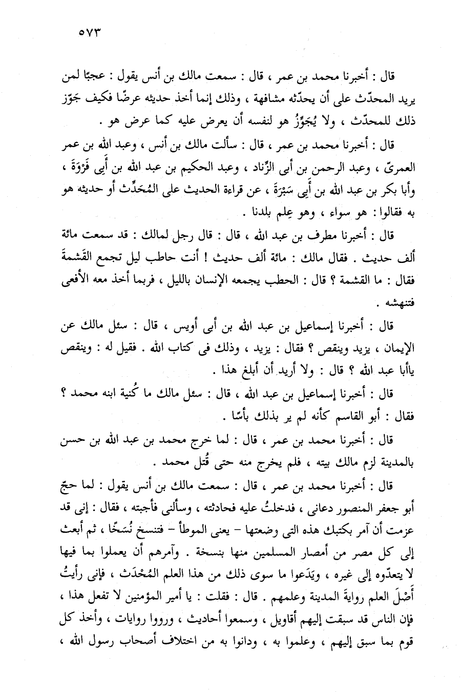 قال: أخبرنا محمد بن عمر، قال: سمعت مالك بن أنس يقول: عجبًا لمن يريد المحدّث على أن يحدّثه مشافهة، وذلك إنما أخذ حديثه عرضًا فكيف جَوّز ذلك للمحدّث، ولا يُجَوِّزُ هو لنفسه أن يعرض عليه كما عرض هو.