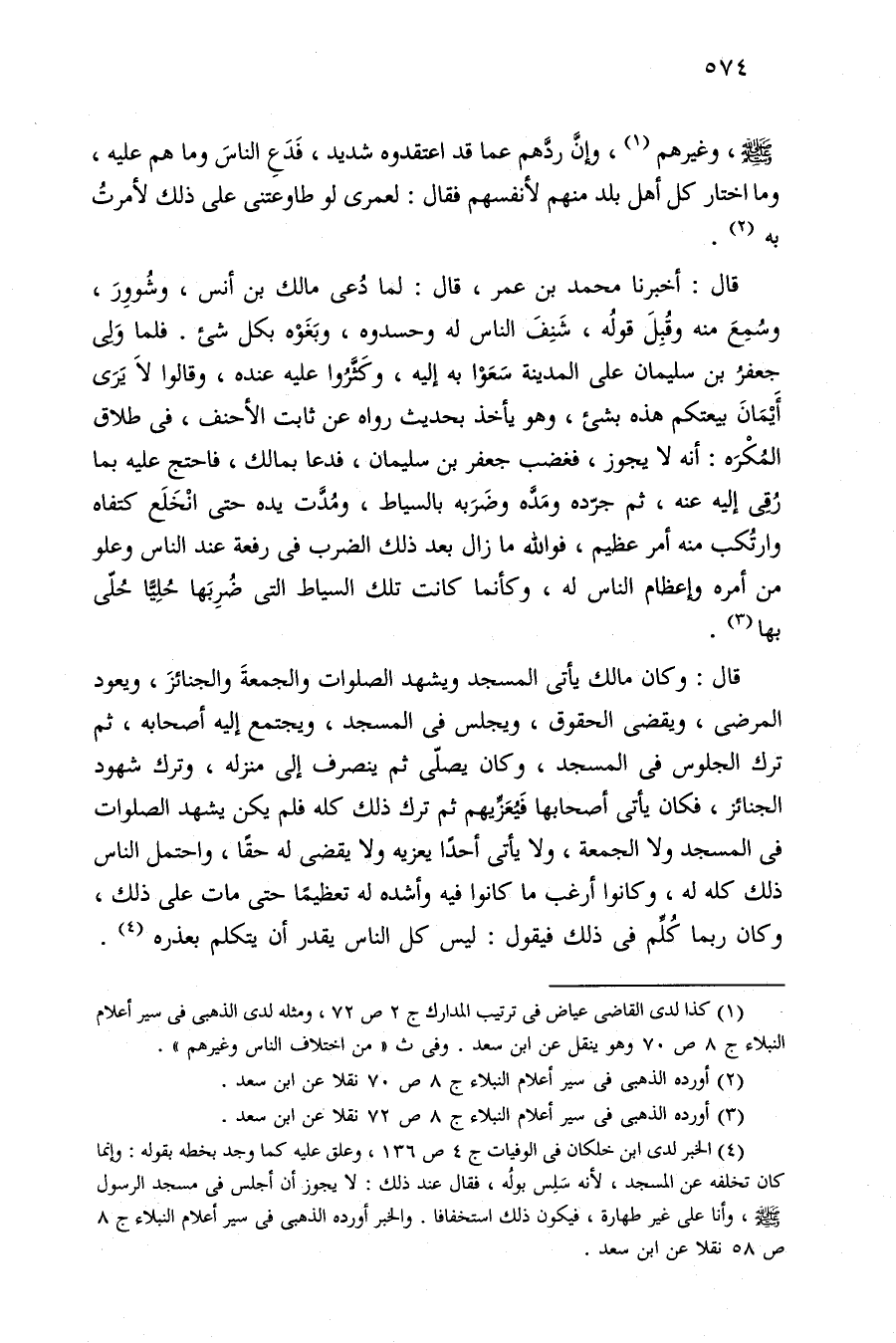 قال: أخبرنا محمد بن عمر، قال: لما دُعى مالك بن أنس، وشُووِرَ، وسُمِعَ منه وقُبِلَ قولُه، شَنِفَ الناس له وحسدوه، وبَغَوْه بكل شيء. فلما وَلِى جعفرُ بن سليمان على المدينة سَعَوْا به إليه، وكَثَّرُوا عليه عنده، وقالوا لَا يَرَى أَيْمَانَ بيعتكم هذه بشيء، وهو يأخذ بحديث رواه عن ثابت الأحنف، في طلاق المُكْرَه: أنه لا يجوز، فغضب جعفر بن سليمان، فدعا بمالك، فاحتج عليه بما رُقِى إليه عنه، ثم جرّده ومَدَّه وضَرَبه بالسياط، ومُدَّت يده حتى انْخَلَع كتفاه وارتُكب منه أمر عظيم، فوالله ما زال بعد ذلك الضرب في رفعة عند الناس وعلو من أمره وإعظام الناس له، وكأنما كانت تلك السياط التي ضُرِبَها حُلِيًّا حُلّى بها (¬٣).