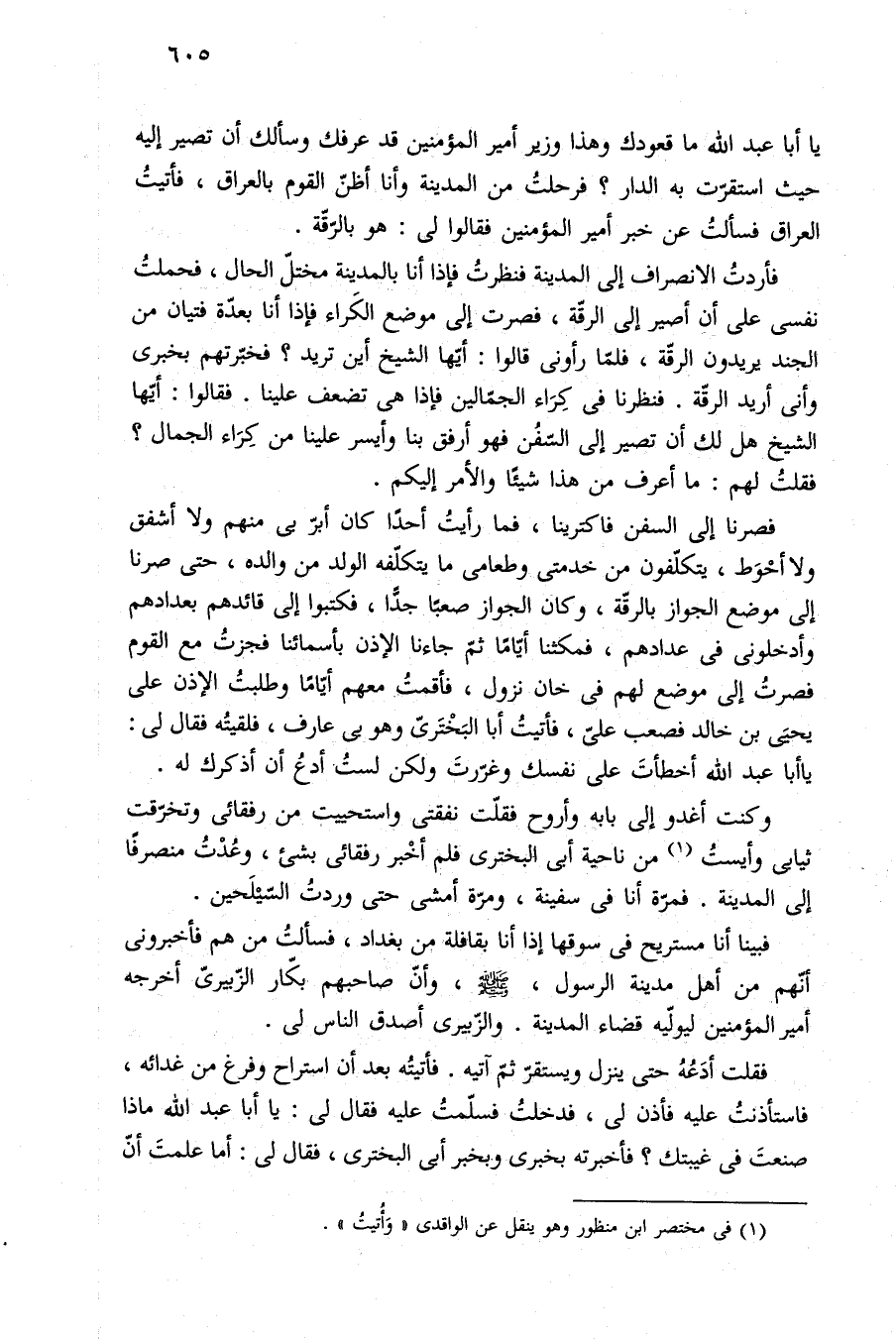 فصرنا إلى السفن فاكترينا، فما رأيتُ أحدًا كان أبرّ بي منهم ولا أشفق ولا أحْوَط، يتكلّفون من خدمتى وطعامى ما يتكلّفه الولد من والده، حتى صرنا إلى موضع الجواز بالرقّة، وكان الجواز صعبًا جدًّا، فكتبوا إلى قائدهم بعدادهم وأدخلونى في عدادهم، فمكثنا أيّامًا ثمّ جاءنا الإذن بأسمائنا فجزتُ مع القوم فصرتُ إلى موضع لهم في خان نزول، فأقمتُ. معهم أيّامًا وطلبتُ الإذن على يحيَى بن خالد فصعب علىّ، فأتيتُ أبا البَخْتَرىّ وهو بي عارف، فلقيتُه فقال لي: يا أبا عبد الله أخطأتَ على نفسك وغرّرتَ ولكن لستُ أدعُ أن أذكرك له.