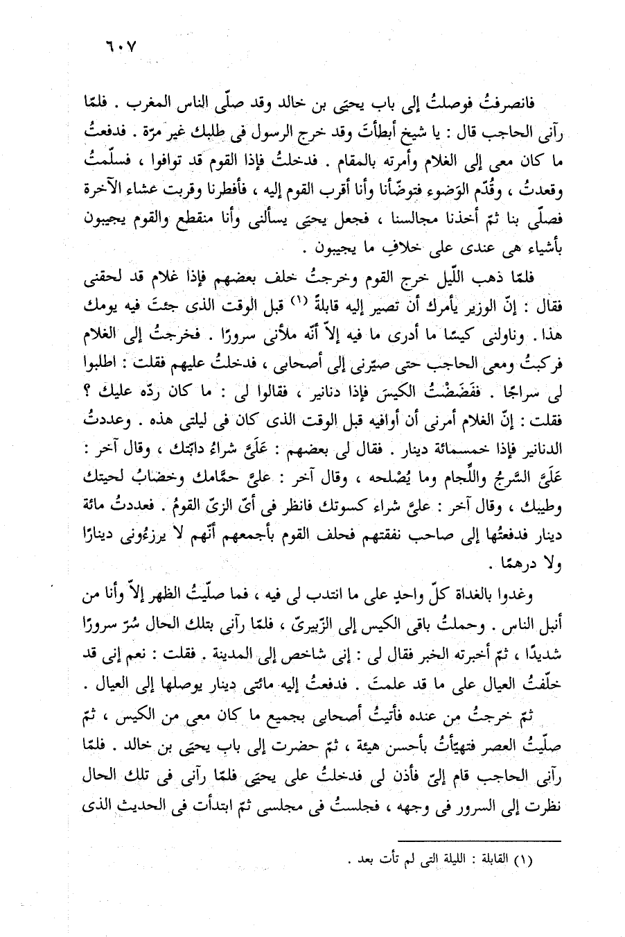 فانصرفتُ فوصلتُ إلى باب يحيَى بن خالد وقد صلّى الناس المغرب. فلمّا رآنى الحاجب قال: يا شيخ أبطأتَ وقد خرج الرسول في طلبك غير مرّة. فدفعتُ ما كان معى إلى الغلام وأمرته بالمقام. فدخلتُ فإذا القوم قد توافوا، فسلّمتُ وقعدتُ، وقُدّم الوَضوء فتوضّأنا وأنا أقرب القوم إليه، فأفطرنا وقربت عشاء الآخرة فصلّى بنا ثمّ أخذنا مجالسنا، فجعل يحيَى يسألنى وأنا منقطع والقوم يجيبون بأشياء هي عندى على خلافِ ما يجيبون.