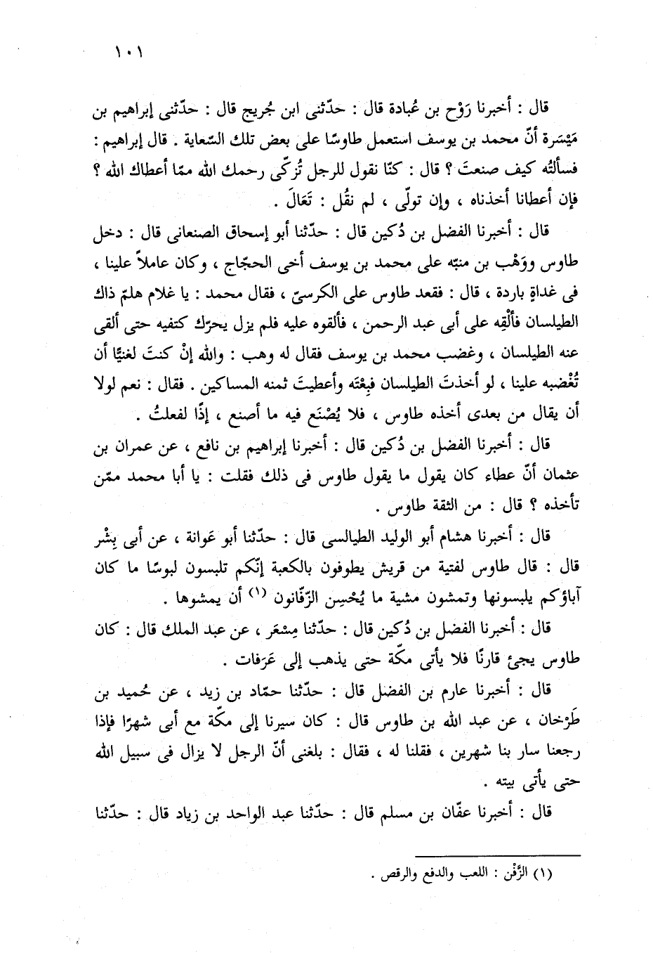 قال: أخبرنا هشام أبو الوليد الطيالسى قال: حدّثنا أبو عَوانة، عن أبي بِشْر قال: قال طاوس لفتية من قريش يطوفون بالكعبة إنّكم تلبسون لبوسًا ما كان آباؤكم يلبسونها وتمشون مشية ما يُحْسِن الزّفّانون (¬١) أن يمشوها.