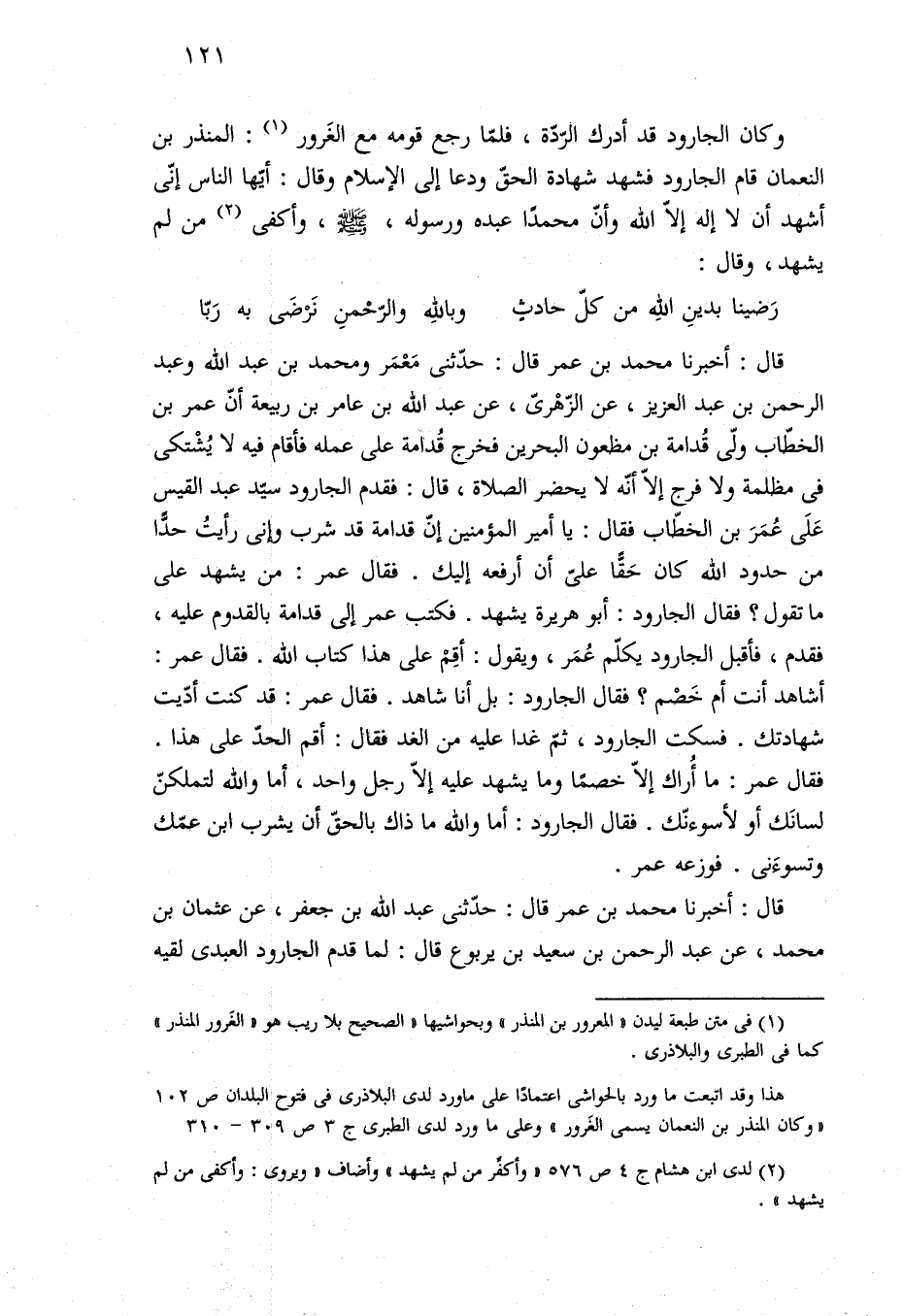 هذا وقد اتبعت ما ورد بالحواشى اعتمادًا على ما ورد لدى البلاذرى في فتوح البلدان ص ١٠٢ "وكان المنذر بن النعمان يسمى الغَرور" وعلى ما ورد لدى الطبري ج ٣ ص ٣٠٩ - ٣١٠.