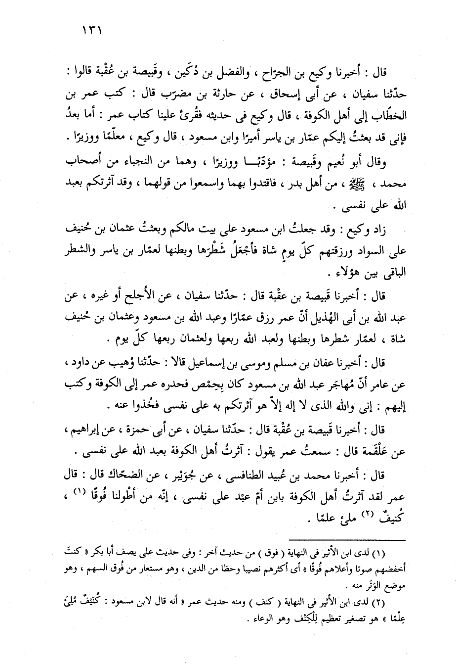 قال: أخبرنا وكيع بن الجرّاح، والفضل بن دُكَين، وقَبيصة بن عُقْبة قالوا: حدّثنا سفيان، عن أبي إسحاق، عن حارثة بن مضرّب قال: كتب عمر بن الخطّاب إلى أهل الكوفة، قال وكيع في حديثه فقُرئ علينا كتاب عمر: أما بعدُ فإنى قد بعثتُ إليكم عمّار بن ياسر أميرًا وابن مسعود، قال وكيع، معلّمًا ووزيرًا.