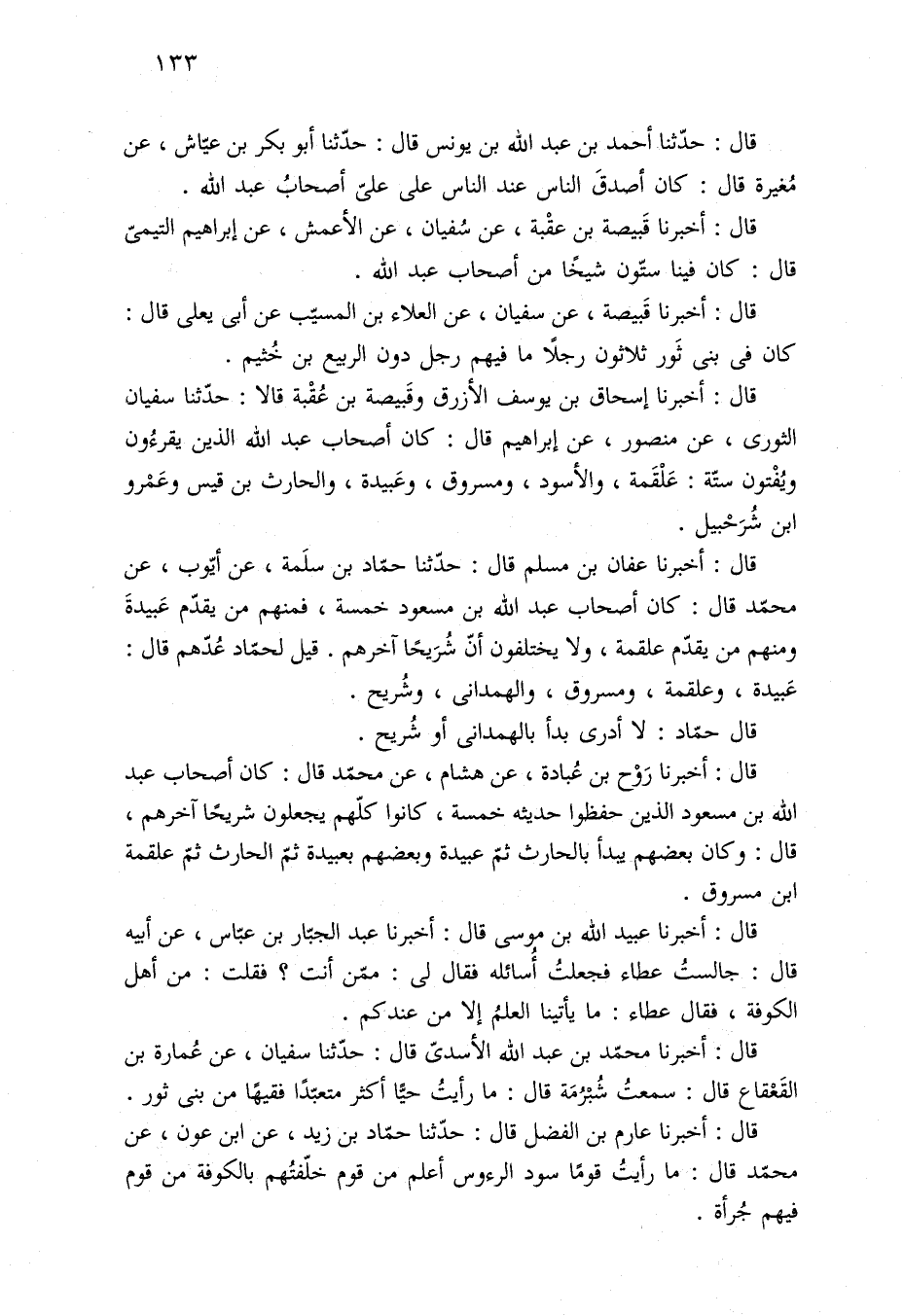 قال: أخبرنا إسحاق بن يوسف الأزرق وقَبيصة بن عُقْبة قال: حدّثنا سفيان الثورى، عن منصور، عن إبراهيم قال: كان أصحاب عبد الله الذين يقرءُون ويُفْتون ستّة: عَلْقَمة، والأسود، ومسروق، وعَبيدة، والحارث بن قيس وعَمْرو ابن شُرَحْبيل.