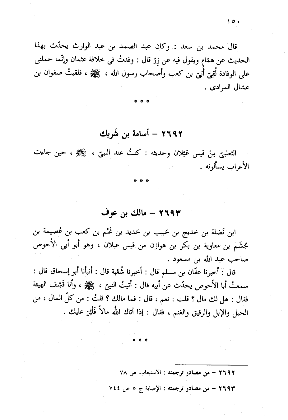 قال: أخبرنا عفّان بن مسلم قال: أخبرنا شُعْبة قال: أنبأنا أبو إسحاق قال: سمعتُ أبا الأحوص يحدّث عن أبيه قال: أتيتُ النبيّ، -صلى الله عليه وسلم-، وأنا قَشِف الهيئة فقال: هل لك مال؟ قلت: نعم، قال: فما مالك؟ قلتُ: من كلّ المال، من الخيل والإبل والرقيق والغنم، فقال: إذا آتاك الله مالًا فَلْيُرَ عليك.