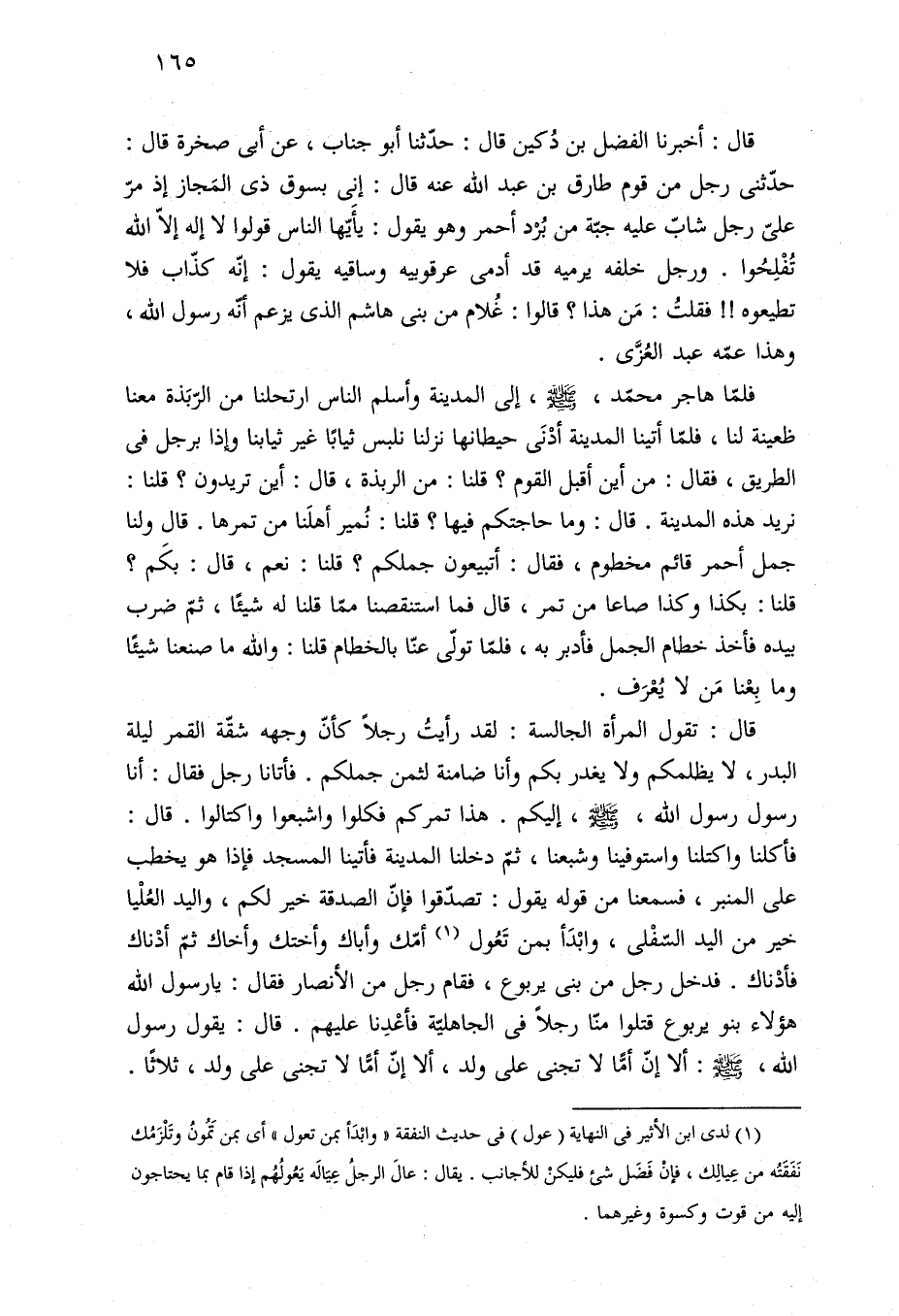 فلمّا هاجر محمّد، -صلى الله عليه وسلم-، إلى المدينة وأسلم الناس ارتحلنا من الرّبَذة معنا ظعينة لنا، فلمّا أتينا المدينة أدْنَى حيطانها نزلنا نلبس ثيابًا غير ثيابنا وإذا برجل في الطريق، فقال: من أين أقبل القوم؟ قلنا: من الربذة، قال: أين تريدون؟ قلنا: نريد هذه المدينة. قال: وما حاجتكم فيها؟ قلنا: نُمير أهلَنا من تمرها. قال ولنا جمل أحمر قائم مخطوم، فقال: أتبيعون جملكم؟ قلنا: نعم، قال: بكَم؟ قلنا: بكذا وكذا صاعا من تمر، قال فما استنقصنا ممّا قلنا له شيئًا، ثمّ ضرب بيده فأخذ خطام الجمل فأدبر به، فلمَّا تولّى عنّا بالخطام قلنا: والله ما صنعنا شيئًا وما بِعْنا مَن لا يُعْرَف.
