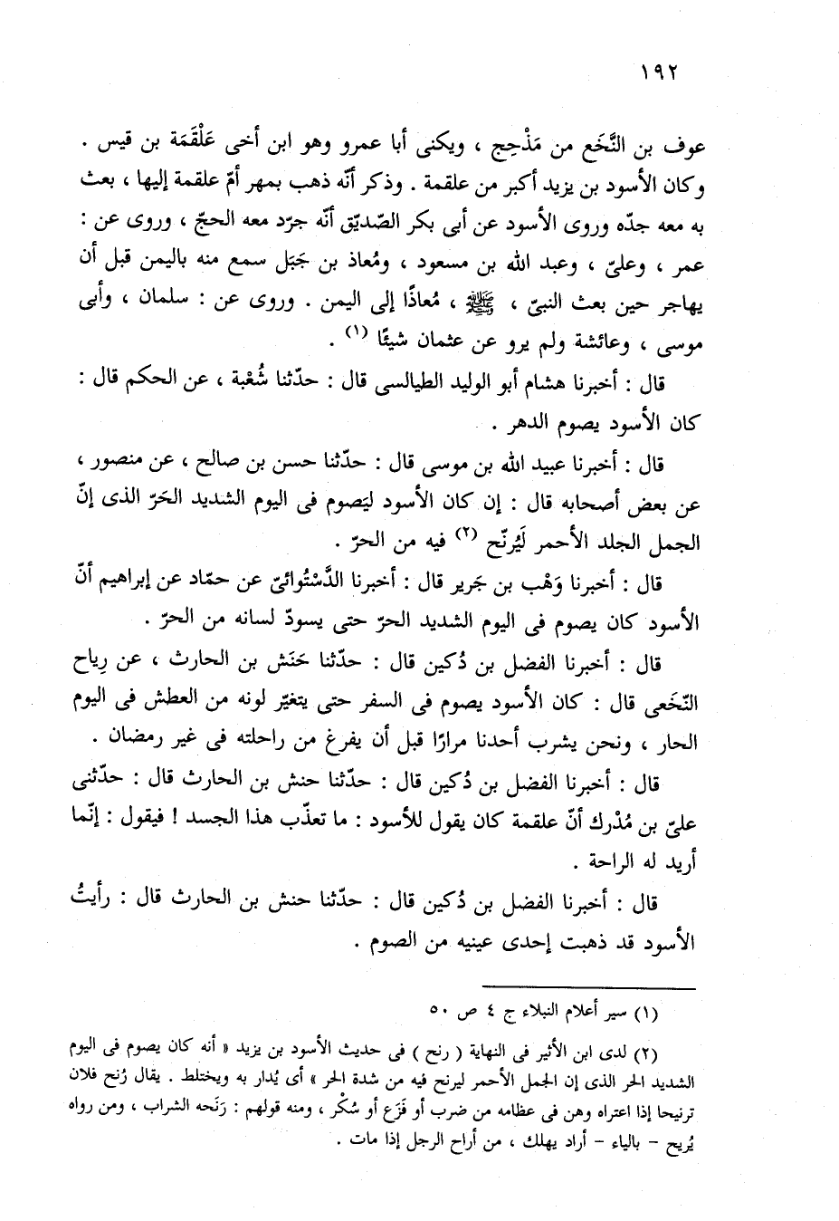 قال: أخبرنا وَهْب بن جَرير قال: أخبرنا الدَّسْتُوائيّ عن حمّاد عن إبراهيم أنّ الأسود كان يصوم في اليوم الشديد الحرّ حتى يسودّ لسانه من الحرّ.